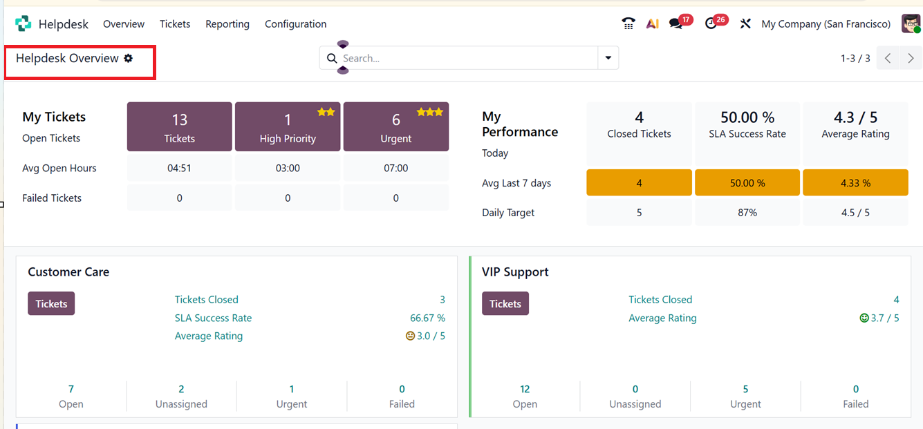 When you first activate the module, you will see the main dashboard, as shown in the corresponding screenshot. This area is known as the Helpdesk Overview. It gives you a quick summary of the most important features and performance indicators of the module. From this screen, you can access the My Tickets, Customer Care, My Performance and VIP Support sections, as shown in the screenshot below.