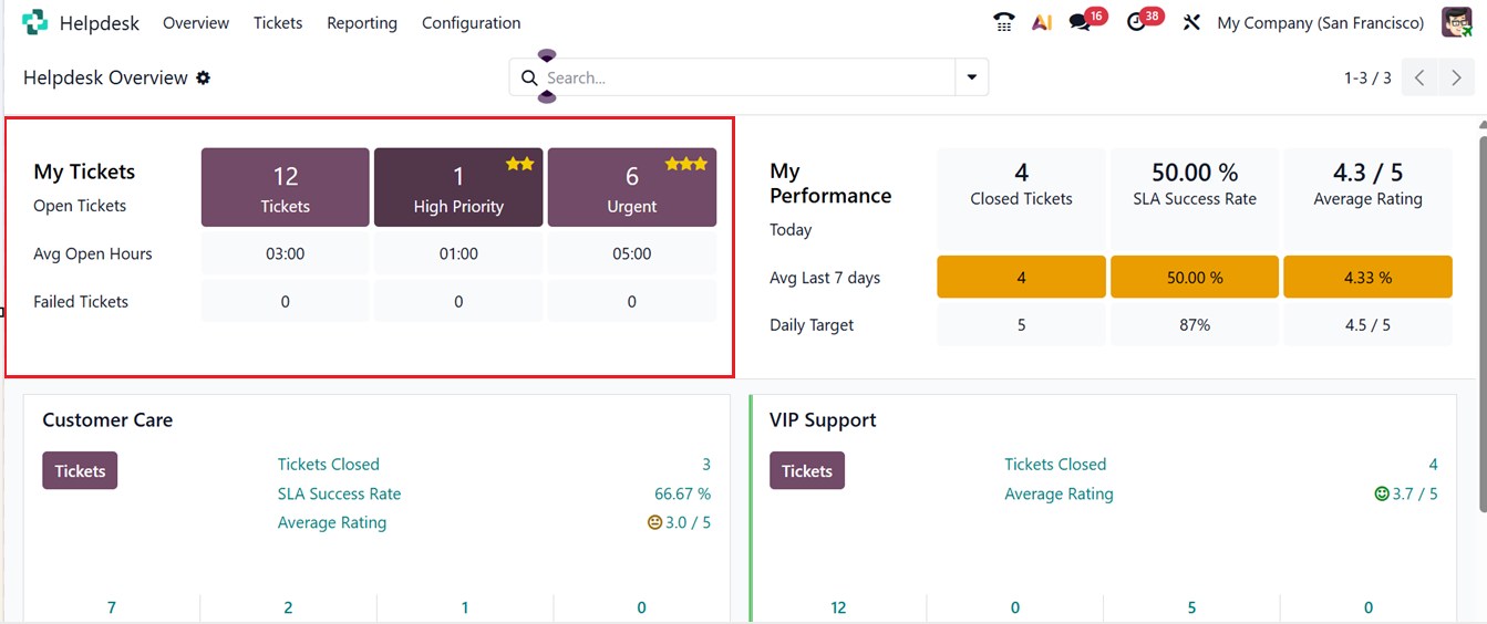 In the My Tickets section, you can view the number of tickets that are currently open, urgent, or marked as high priority. You can also see the average number of hours each ticket has remained open. The section also highlights any tickets that have failed to meet their targets.