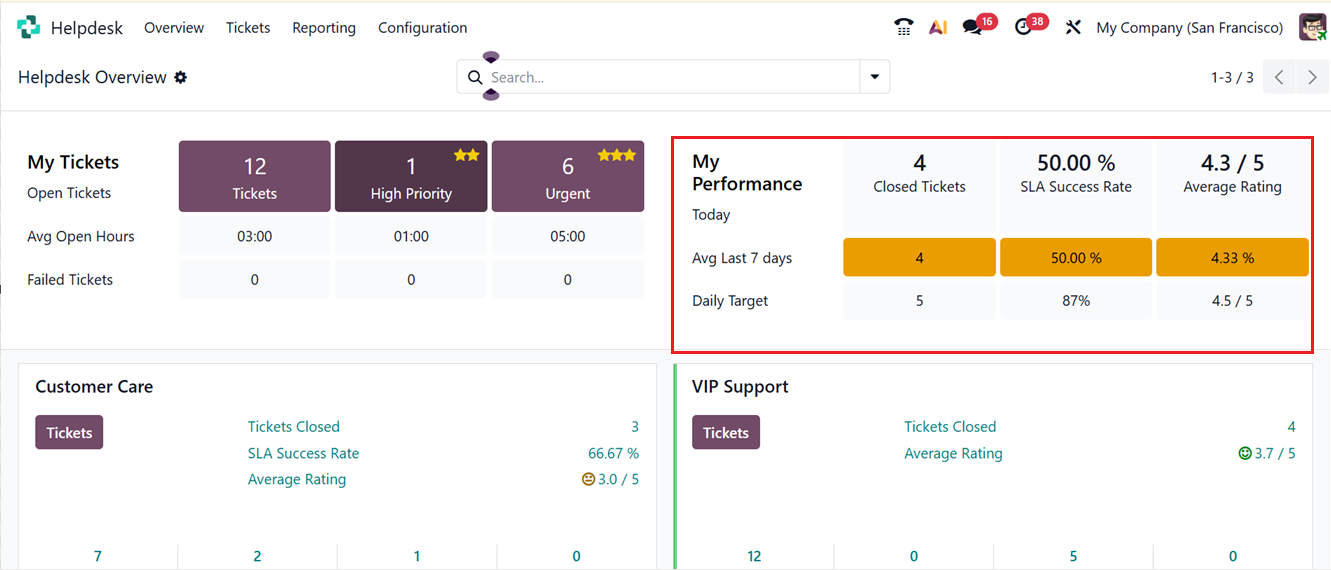 In the My Performance area, you can analyze your overall performance. It provides details such as your average customer rating over the past seven days, the number of closed tickets, and your success rate for the current day. This section also displays your ‘Daily Target,’ helping you monitor whether your goals are being met.