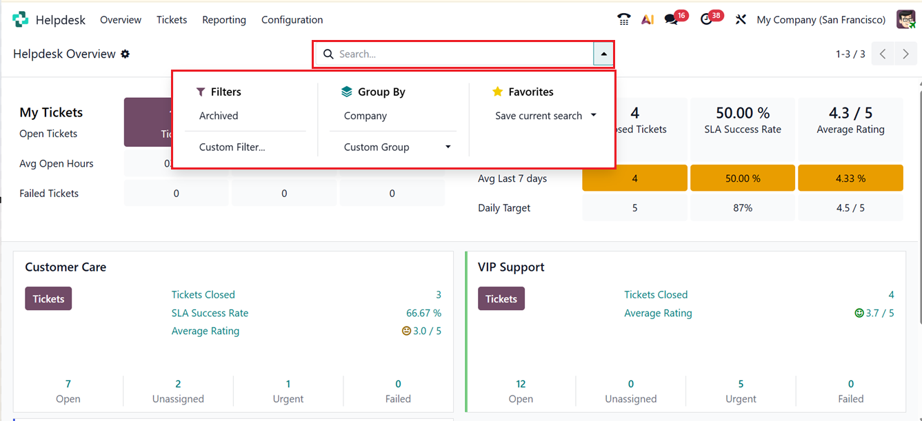 You can refine the displayed data using filters such as Archived or by adding your own Custom Filters. In the Group By menu, you can choose to group data by Company or add a Custom Group of your choice. Within the Odoo Helpdesk module, you can easily create custom filters and groupings by using the “Custom Filter” and “Custom Group” options found in the search view. Then, you can save the recent searches using the ‘Save current search’ option from the ‘Favorites’ section. These tools make it easier to organize and analyze your records based on specific conditions or classifications, as shown in the screenshot below.