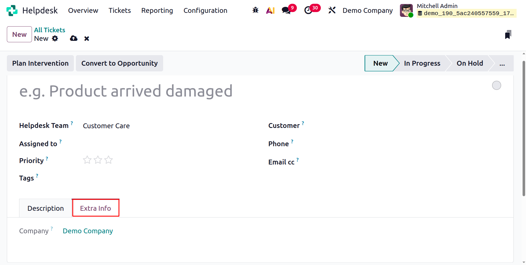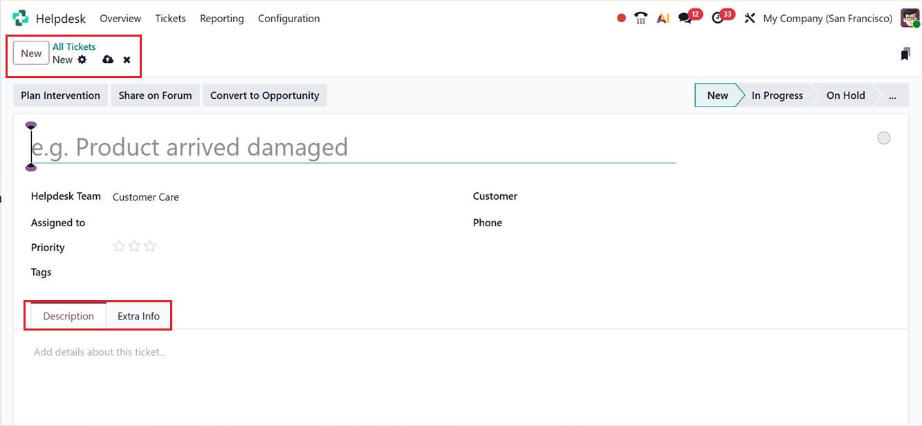 To manually create a new ticket, click on the New button. This opens a new form where you can fill in details about the issue reported by the customer, as shown in the screenshot below.
