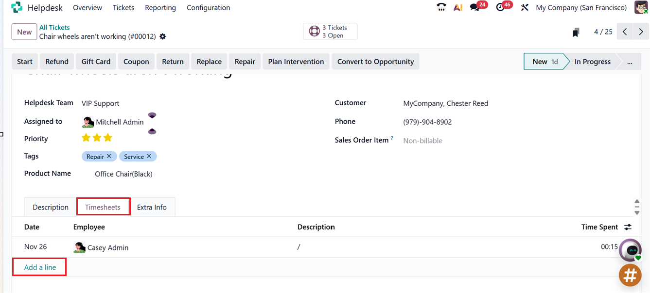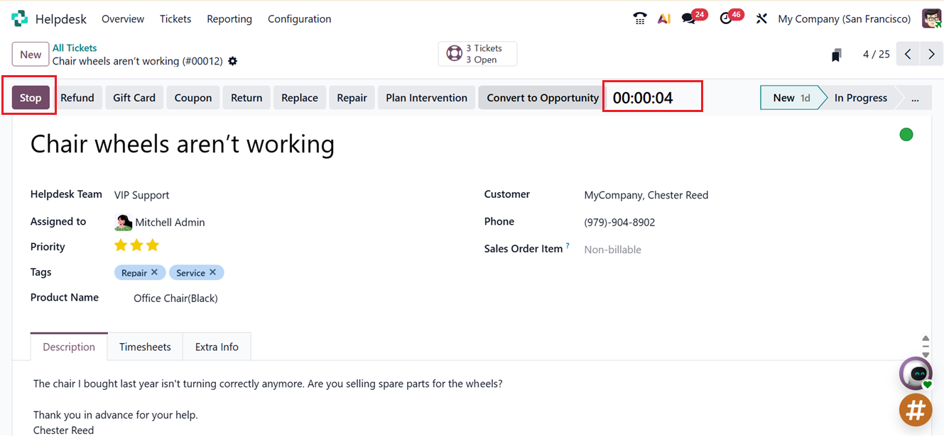 By clicking on the Start button, you can record the time your helpdesk staff spends on resolving the issue. When a team member presses the Start button, Odoo 19 automatically begins tracking the work time, as shown in the screenshot below.