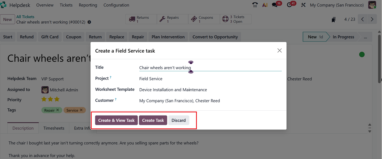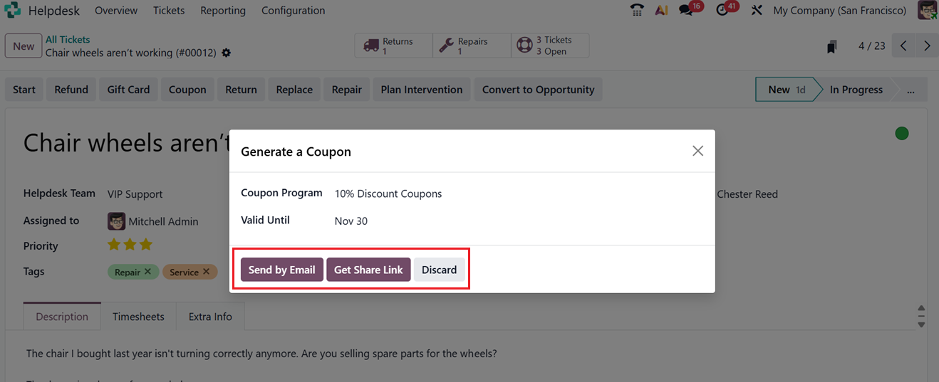 The ‘Returns,’ ‘Repairs,’ ‘Coupons’ and ‘Tickets Open’ smart buttons on the top of the form provides a comprehensive data of the returns, repair orders, coupons, gift cards or tickets associated with this helpdesk ticket.