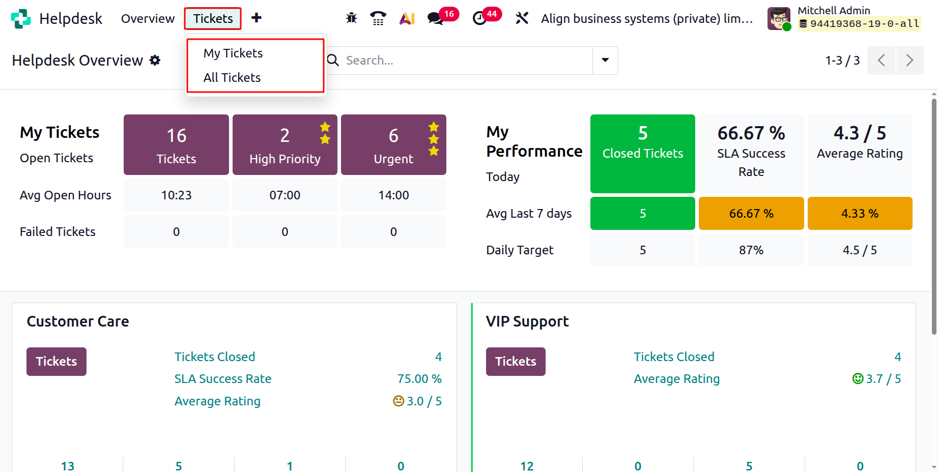 All such tickets, whether created manually or automatically, are organized and managed within the Tickets menu of the Odoo 19 Helpdesk module. Under the Tickets menu, you will find two main options: My Tickets and All Tickets.