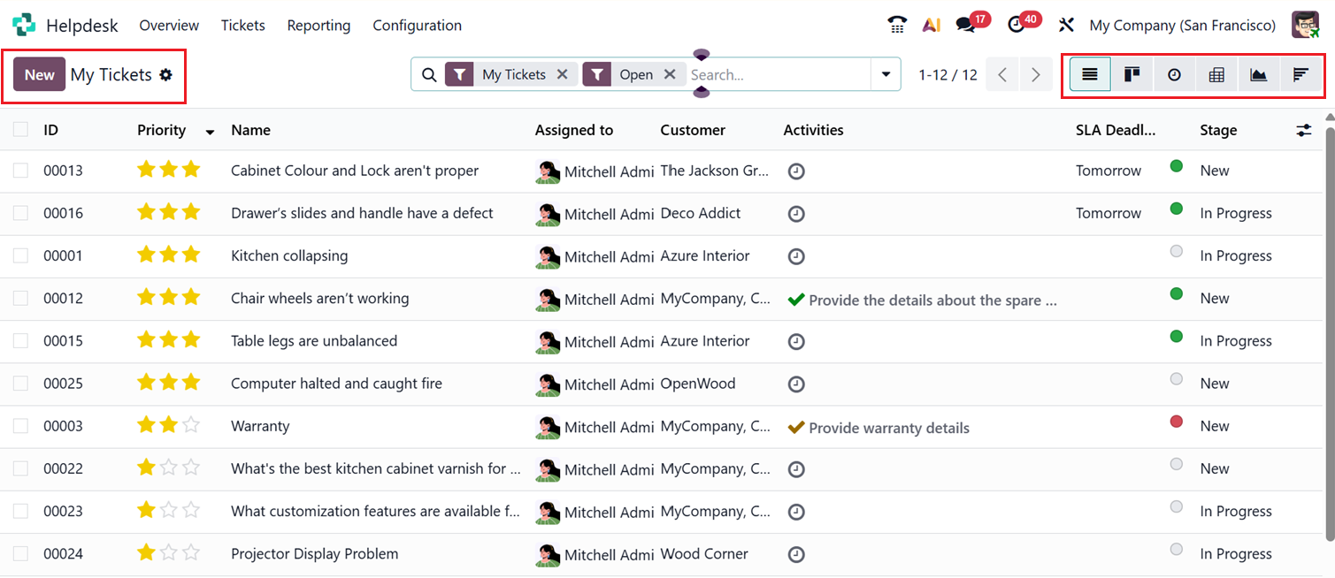 The My Tickets page displays a list of all the tickets that are currently assigned to you. In this section, you can view various details such as the Ticket ID, Priority, Name, Assigned User, Customer, Activities, SLA Deadlines, and the Stage of each ticket, as shown in the screenshot below.