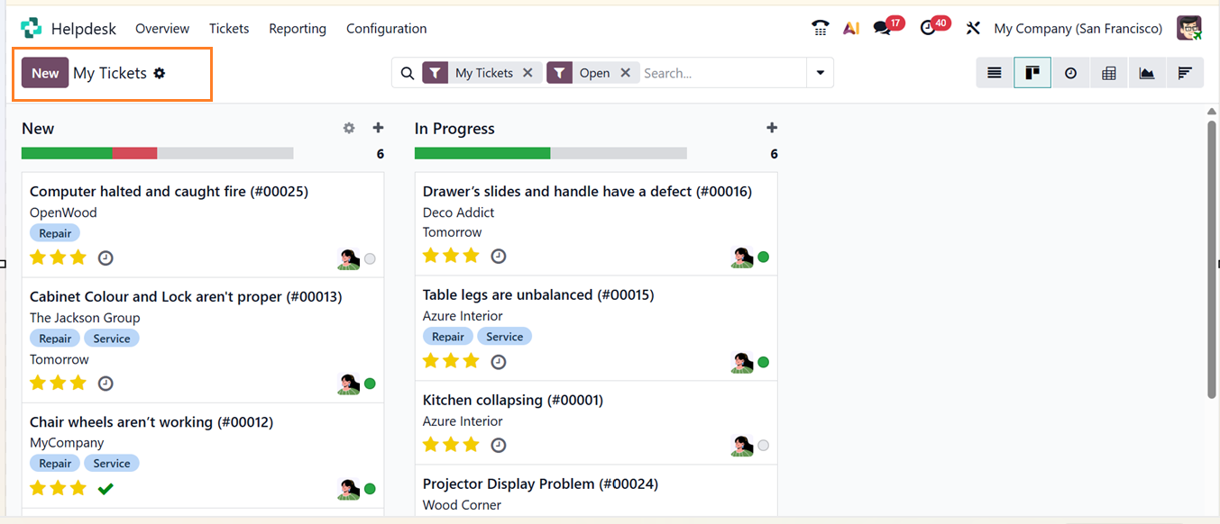 The Kanban View presents the tickets in columns that represent different stages of progress. Each card in this view represents a ticket, and you can drag and drop tickets between stages to update their status.