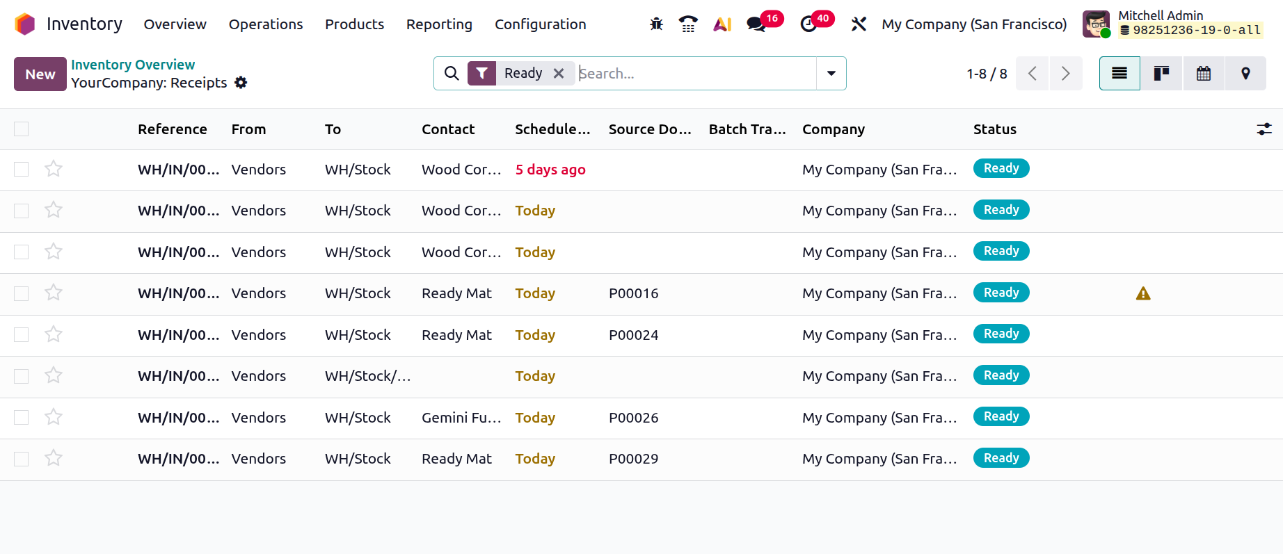 Opening an inventory process will open its detailed dashboard with the receipt Reference, Contact, Scheduled Date, Source Document, Batch Transfer, Company and Status, as shown in the screenshot below.