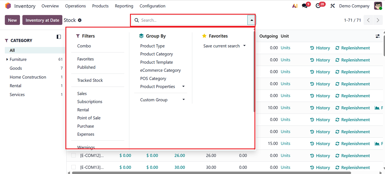 Here, you can utilize the default filters such as Combo, Published, Inventory Management, Point of Sale, Sales, Purchase, Subscriptions, Rental, Expenses, and Favorites can be applied to refine the data shown. In addition, standard Group By options include Product Type, Product Category, and PoS Product Category. To include another grouping method, select the Add Custom Group button. A Favourites option is also available, as indicated in the screenshot below.