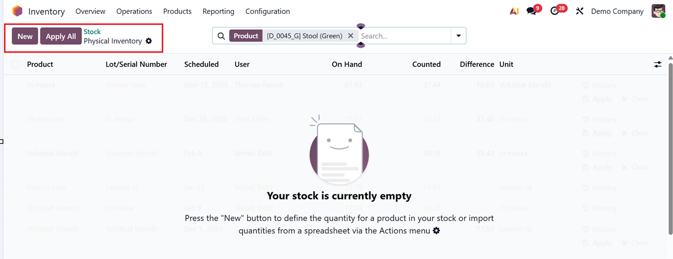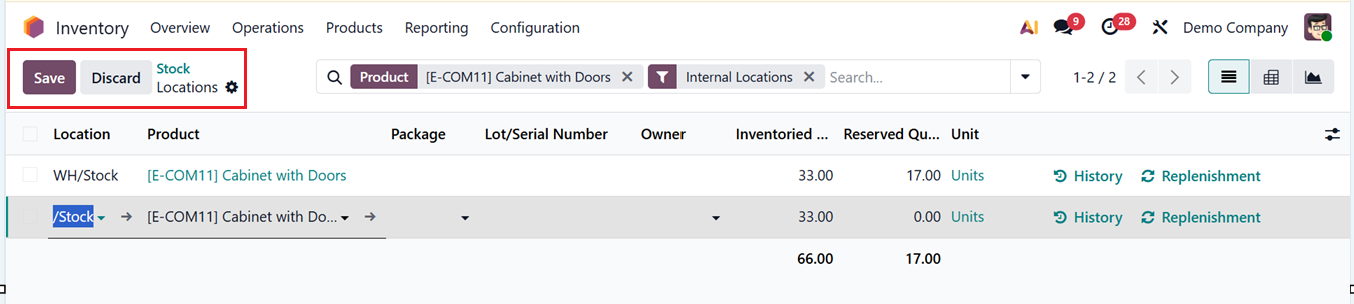 By consolidating these details in one place, users can quickly assess stock availability and allocation across different locations. From this reporting screen, you can take direct actions to manage inventory more efficiently. The History option allows them to review past stock movements for better traceability, while the Replenishment option enables quick restocking of products directly from the report. These features help streamline inventory control and ensure stock levels are maintained without navigating away from the report.