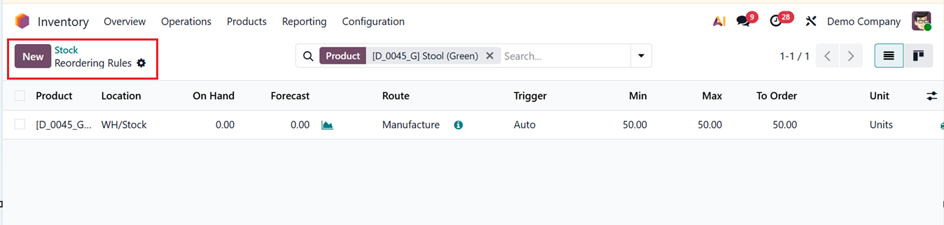 You can click on the ‘New’ button to update the replenishment by mentioning the Product, Location, On Hand quantity, Route, Trigger and other details, as shown in the screenshot below.