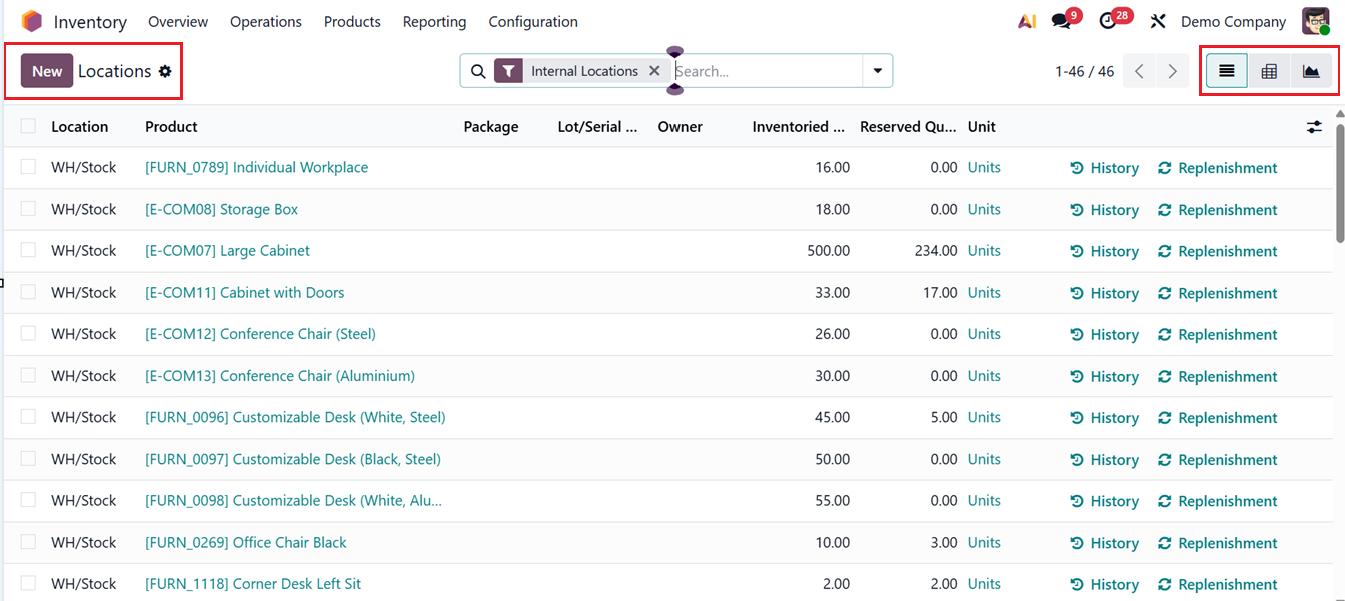 The ‘Locations’ report in Odoo provides a clear list view that presents essential inventory details in a structured format. This view displays key information such as the Location, Product, Package, Lot/Serial Number, Owner, Inventoried Quantity, Reserved Quantity and Unit in a list view, as shown in the screenshot below.
