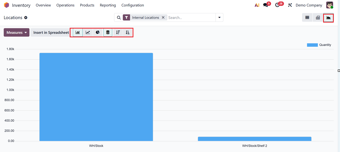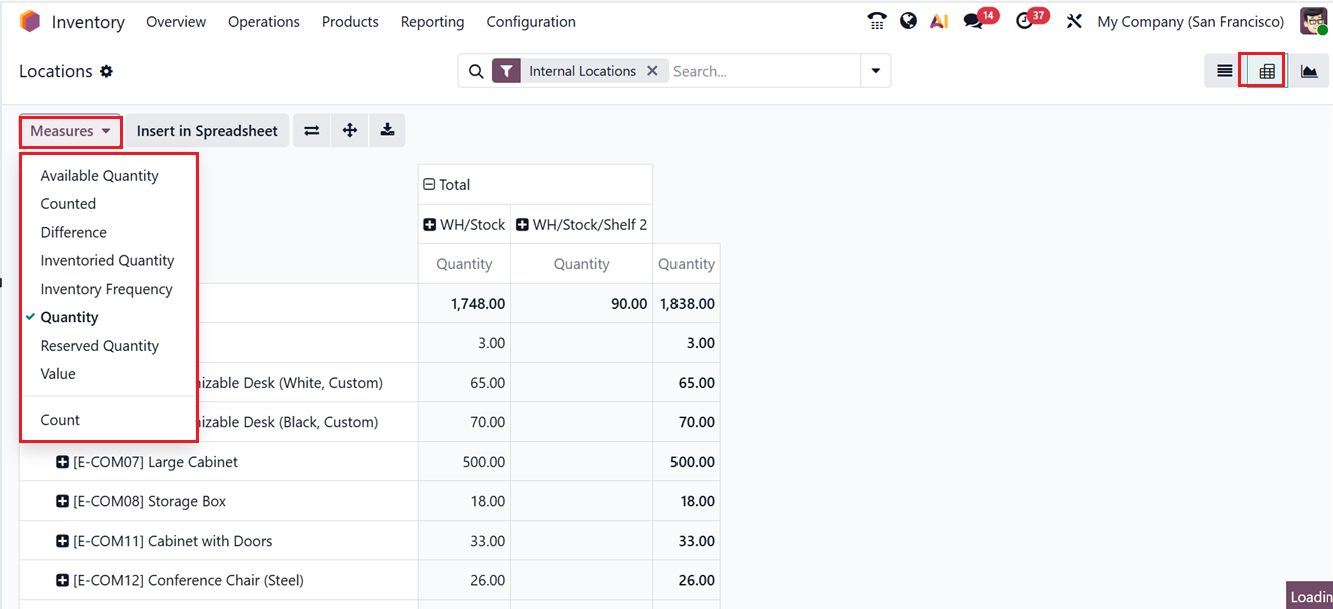 In addition to the List view, location data can also be analyzed using a Graph and Pivot table layout. The Pivot format allows users to summarize and compare inventory information using configurable ‘Measures’ including Available Quantity, Counted, Difference, Inventoried Quantity, Inventory frequency, Quantity, Reserved Quantity, Value and Count options, as shown in the screenshot below.