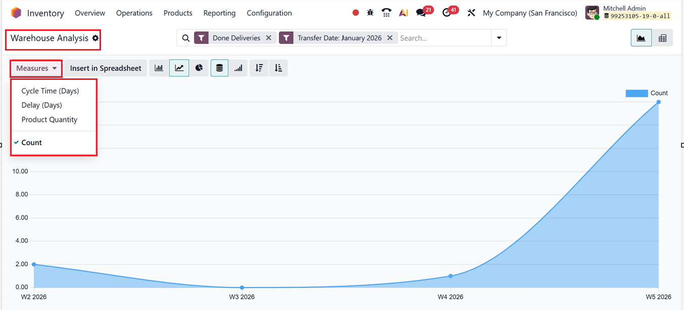 In Odoo 19 Inventory, the Performance reporting window provides a Warehouse Analysis Reporting that helps businesses track and optimize warehouse operations by providing insights into stock movements, efficiency, and resource use. It covers stock movement analysis, inventory valuation and turnover, product and category performance, and warehouse efficiency metrics like picking, packing, and delivery speed.