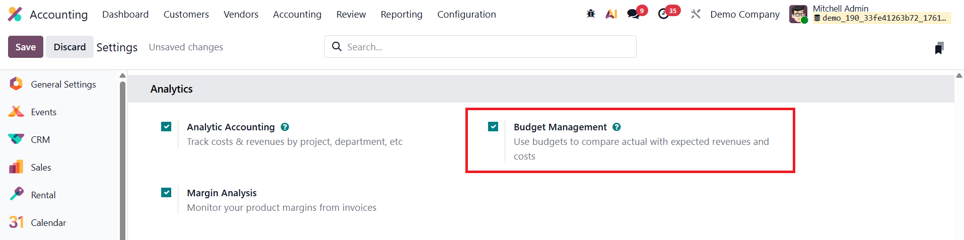 To get started, users must enable the Budget Management option from the Settings menu under the Accounting configuration.