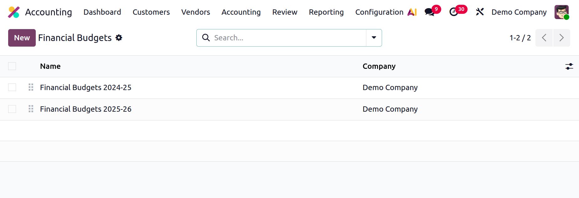 This dashboard displays all existing budgets along with their names and associated companies. To define a new budget, click New, enter a descriptive Name, and specify Budget Items.