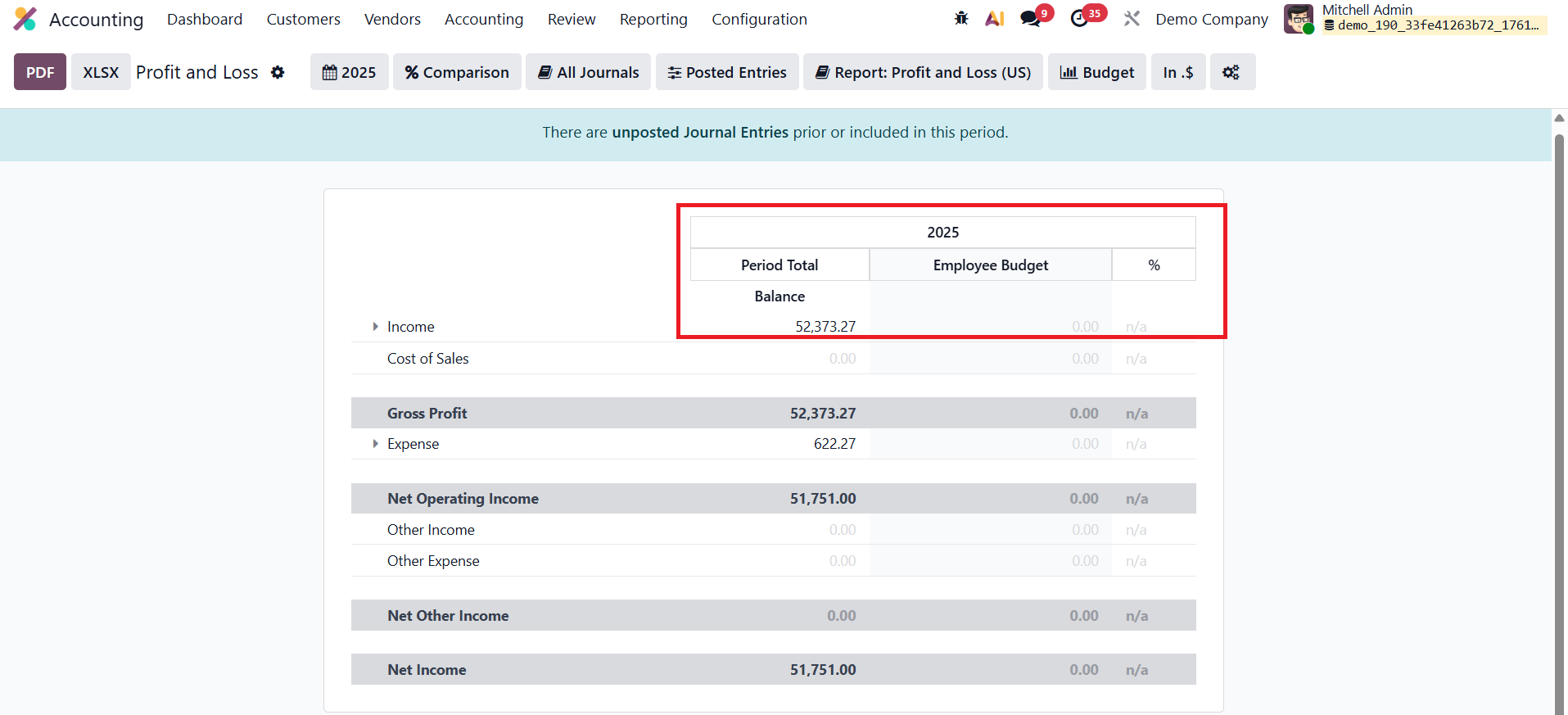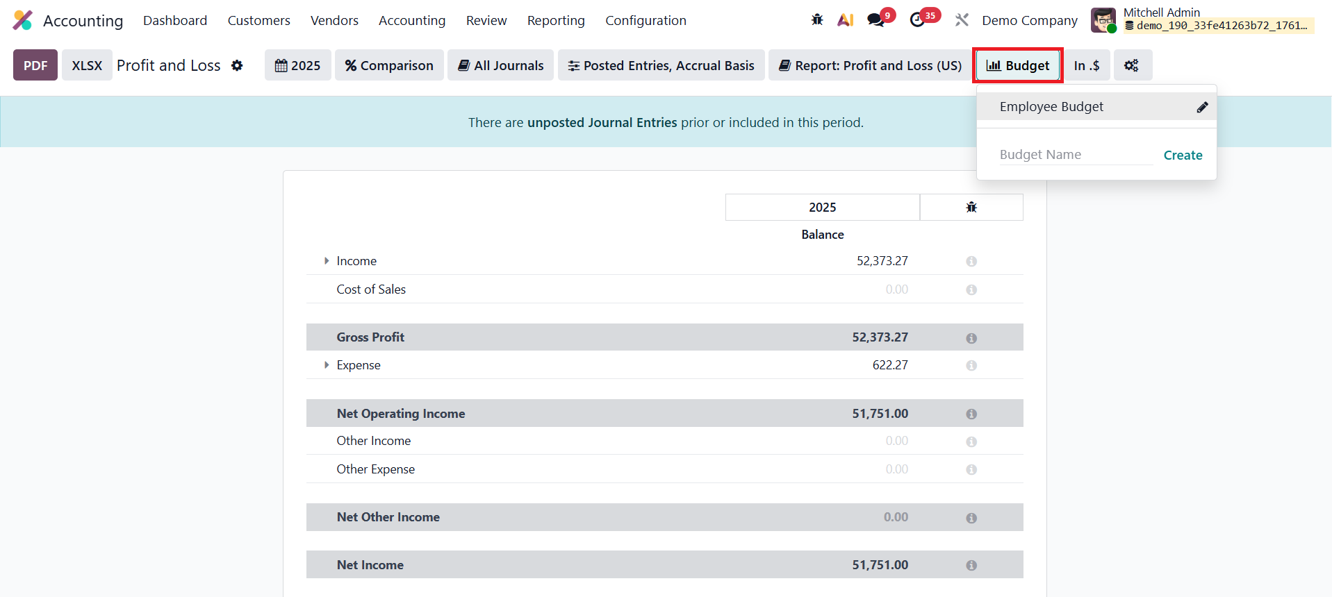 Once the budget is saved, it can be directly integrated into the Profit & Loss report for comparison. Simply go to Accounting ▸ Reporting ▸ Profit & Loss, and select the desired budget from the Budget drop-down menu in the top-right corner.