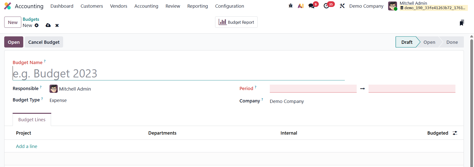 To create a new budget, click New and provide a Budget Name along with the Responsible Employee who will oversee and monitor its progress. The Period field defines the active duration of the budget, while the Company field automatically reflects the database setup. The Budget Type can be categorized as Expense, Revenue, or Both, depending on the financial focus of the plan.