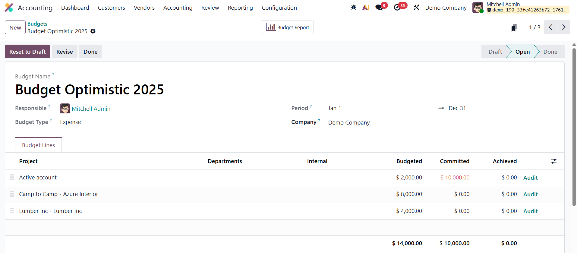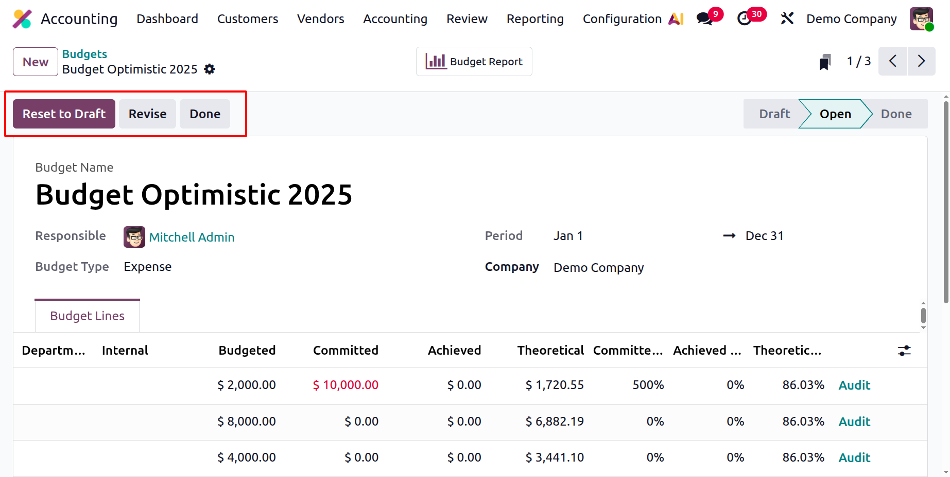 The Revise button is used when you need to update or adjust an already approved budget; it opens the budget for modification without completely cancelling it. The Reset to Draft button sends the budget back to the draft stage, allowing you to fully edit or restructure all its details as if you were creating it anew. Finally, the Done button is used to mark the budget as completed, meaning all planned operations are finished and no further changes are expected. This closes the budget cycle and signals that it is finalized for the period.