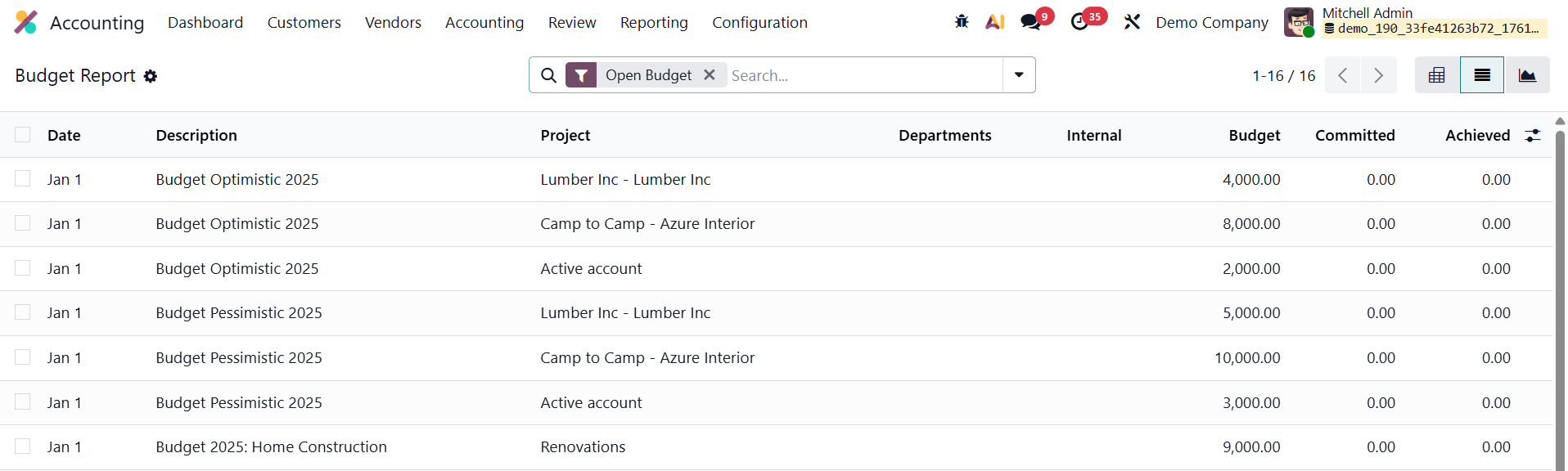 In Odoo 19 Accounting, the Budget Report feature offers an advanced and intuitive way to analyze and evaluate all budgets configured within the system. Accessible from the Reports menu, this tool provides businesses with a clear overview of their financial performance, helping them compare planned allocations against actual results in real time.