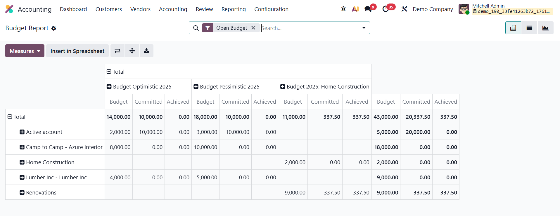 Odoo 19 enhances this reporting experience with improved pivot and graph views, allowing users to visualize budget performance through charts, tables, and trend lines. These analytical tools help decision-makers quickly interpret financial data, track spending patterns, and evaluate how effectively budgets are being implemented across departments or projects.