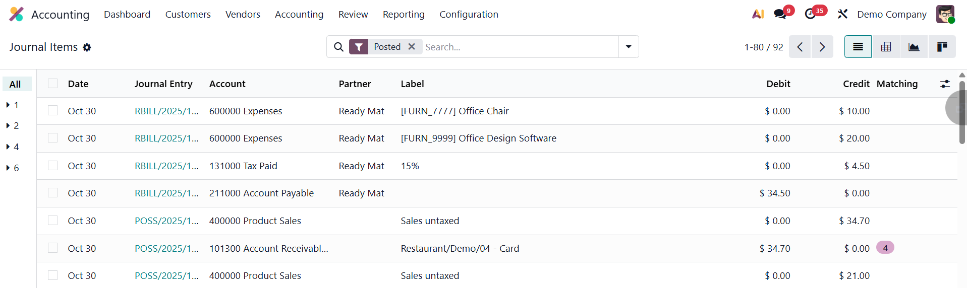The list view displays comprehensive details such as the Date, Journal Entry Number, Account, Partner (if applicable), Label, Debit, Credit, and Matching Number.