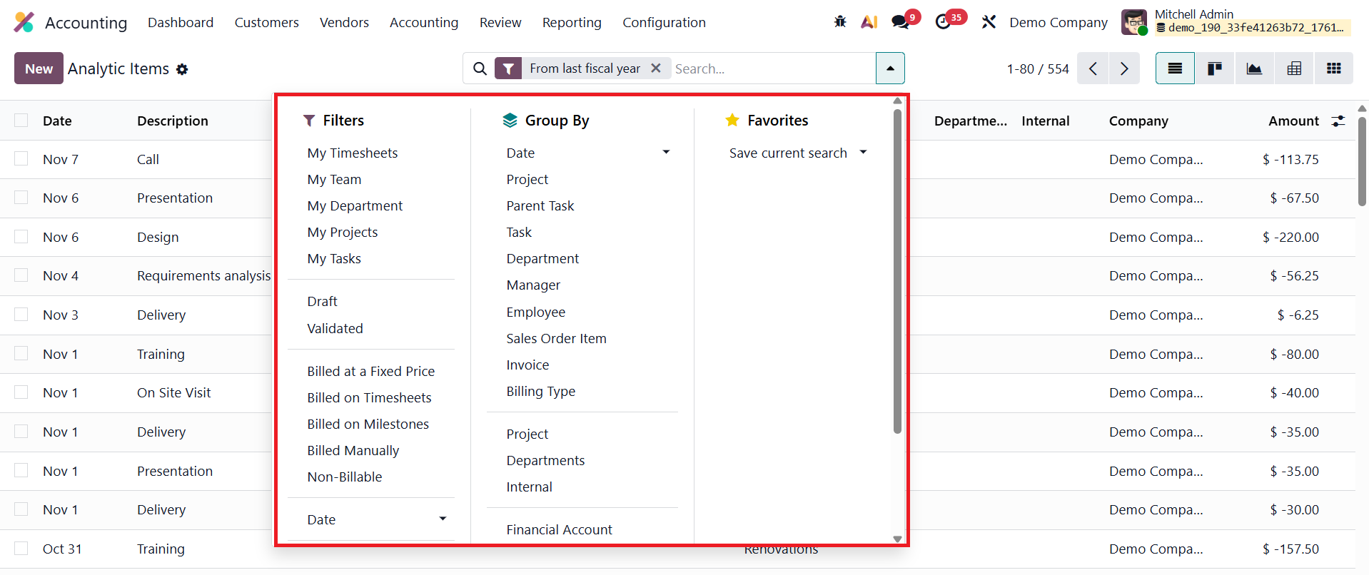 Odoo 19 enhances usability with improved filtering, grouping, and pivot analysis features, allowing users to organize data by analytic accounts, projects, partners, or other dimensions for clearer insights.