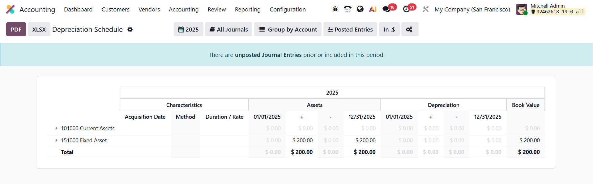 In Odoo 19 Accounting, the Depreciation Schedule offers a clear and detailed overview of an asset’s entire depreciation journey, ensuring complete transparency and control over asset valuation. Accessible through the Review menu, this report compiles all depreciation postings linked to each fixed asset and presents them in an organized format. It displays key information such as the Acquisition Date, Method, Duration/Rate, Assets, Depreciation, and Book Value after each entry is processed.