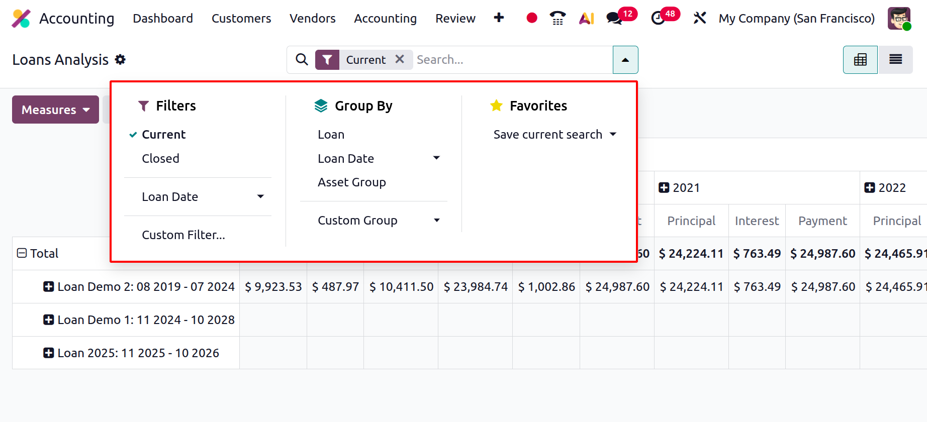 Odoo 19 further refines usability through dynamic filtering and grouping options. Users can apply predefined filters such as Current Loans, Closed Loans, or Loan Date, or create custom filters based on specific conditions like asset type or responsible department. The Group By functionality allows quick restructuring of the report by Loan, Loan Date, or Asset Group, enabling multi-dimensional analysis from various accounting perspectives. For convenience, Odoo 19 also lets users save custom report layouts, so frequently used filters and pivot configurations can be reloaded instantly.