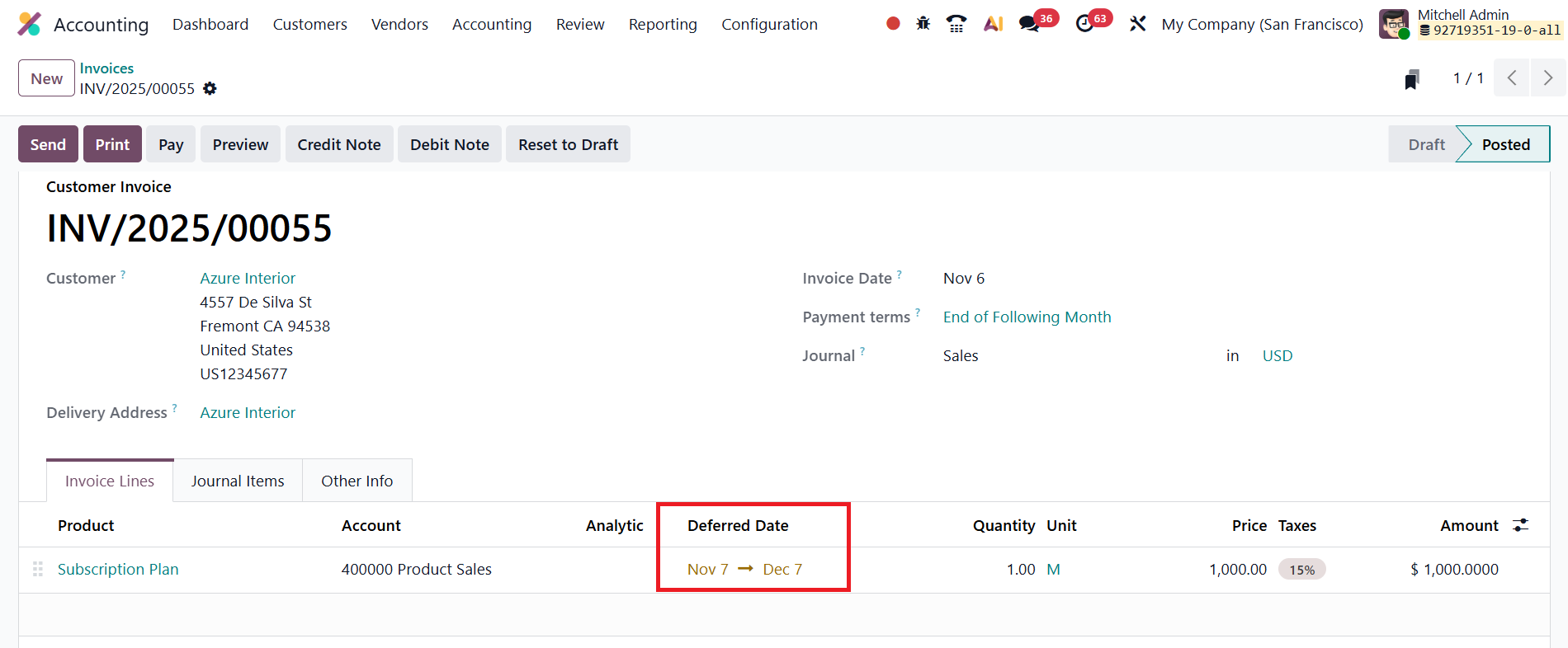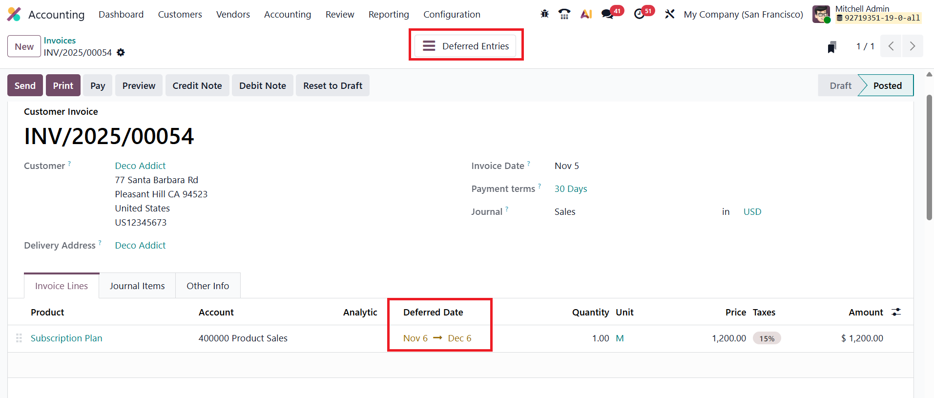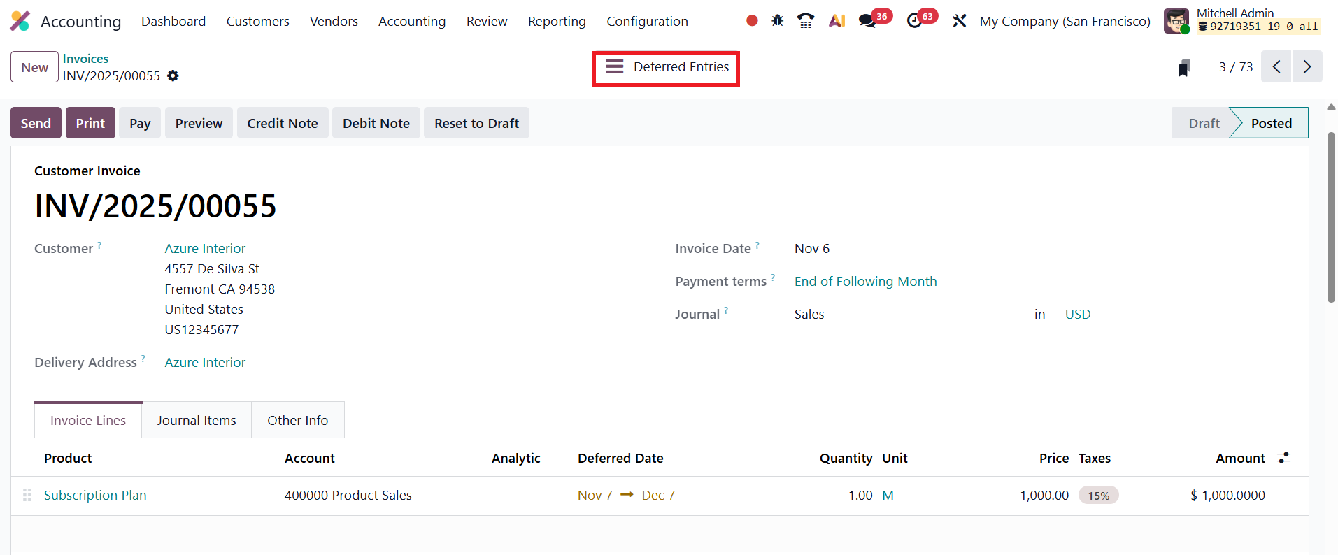 Once the invoice details are entered and the document is confirmed, Odoo 19 automatically generates the corresponding deferred entries. You can access them using the Deferred Entries smart button.
