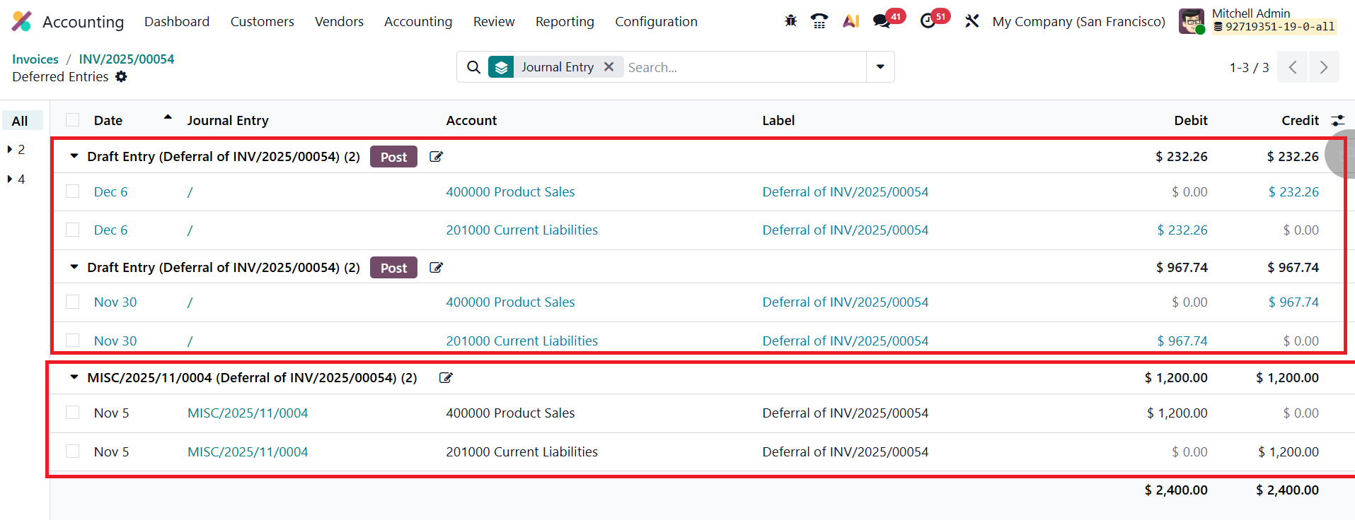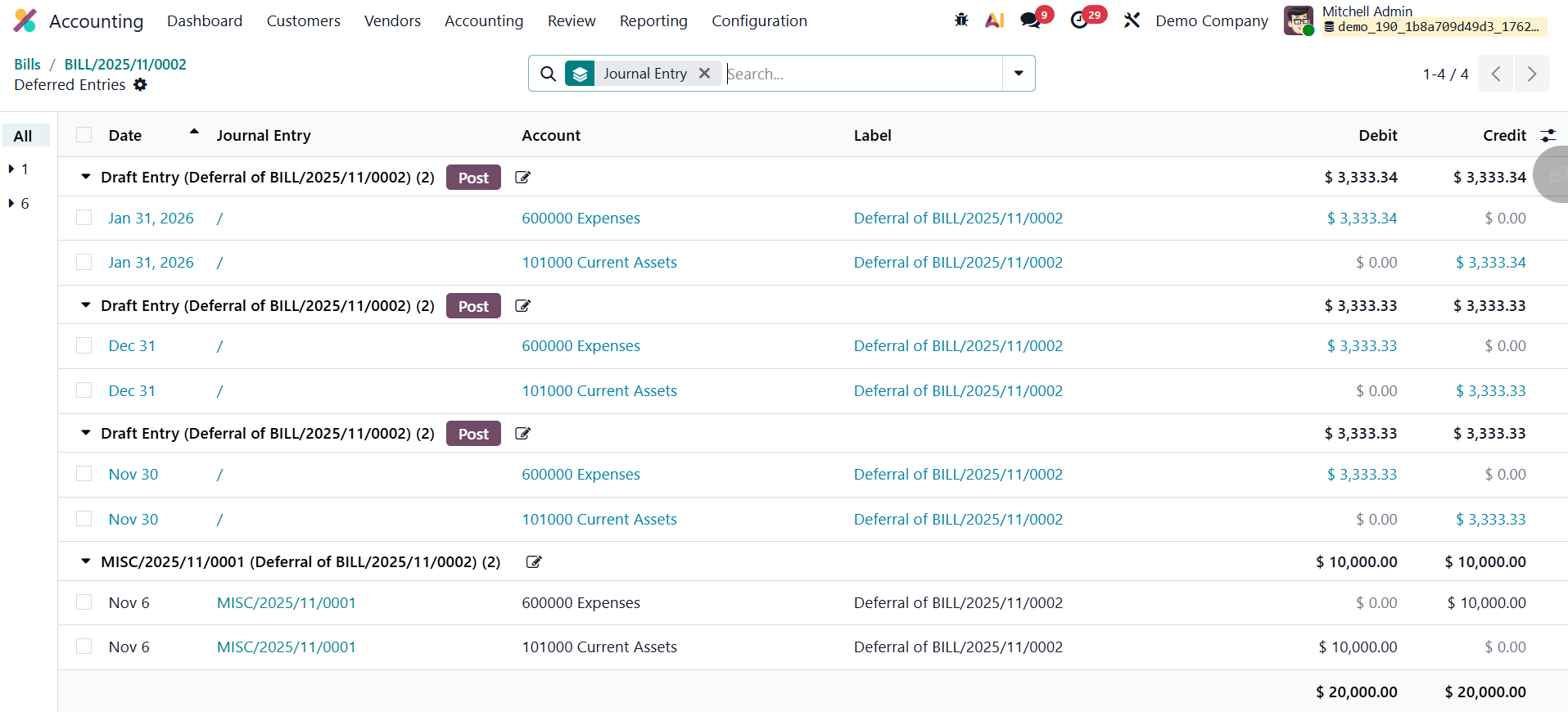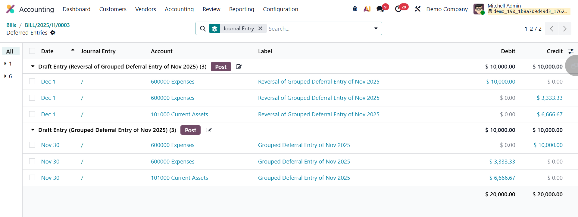 Users can review these journal entries through the Deferred Entries smart button available on the vendor bill.