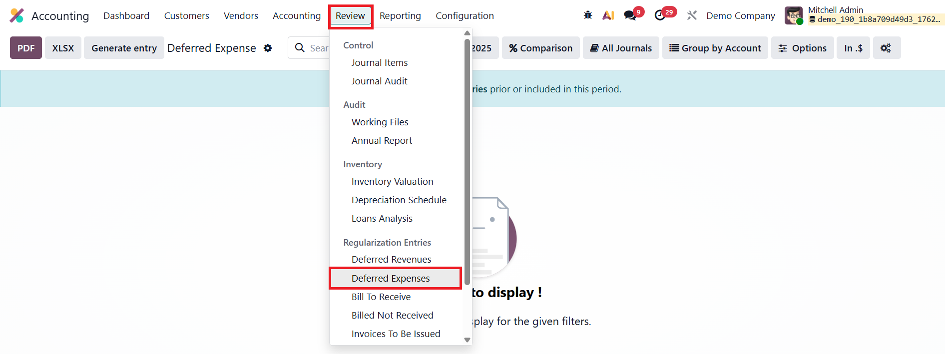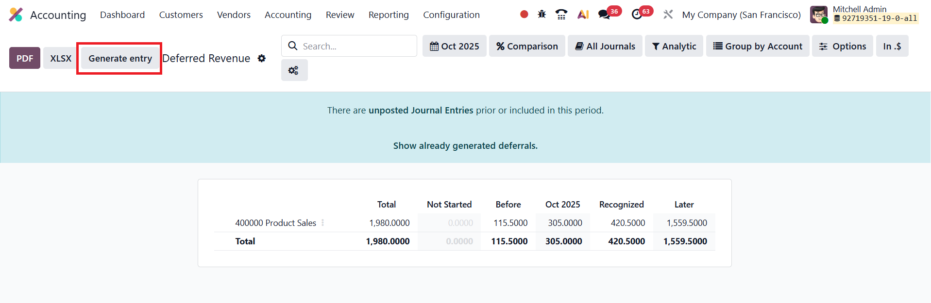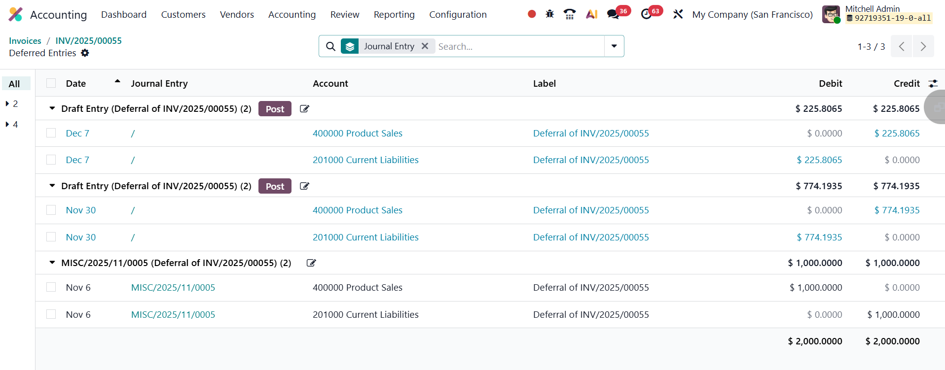Users can review these journal entries through the Deferred Entries smart button available on the vendor bill.