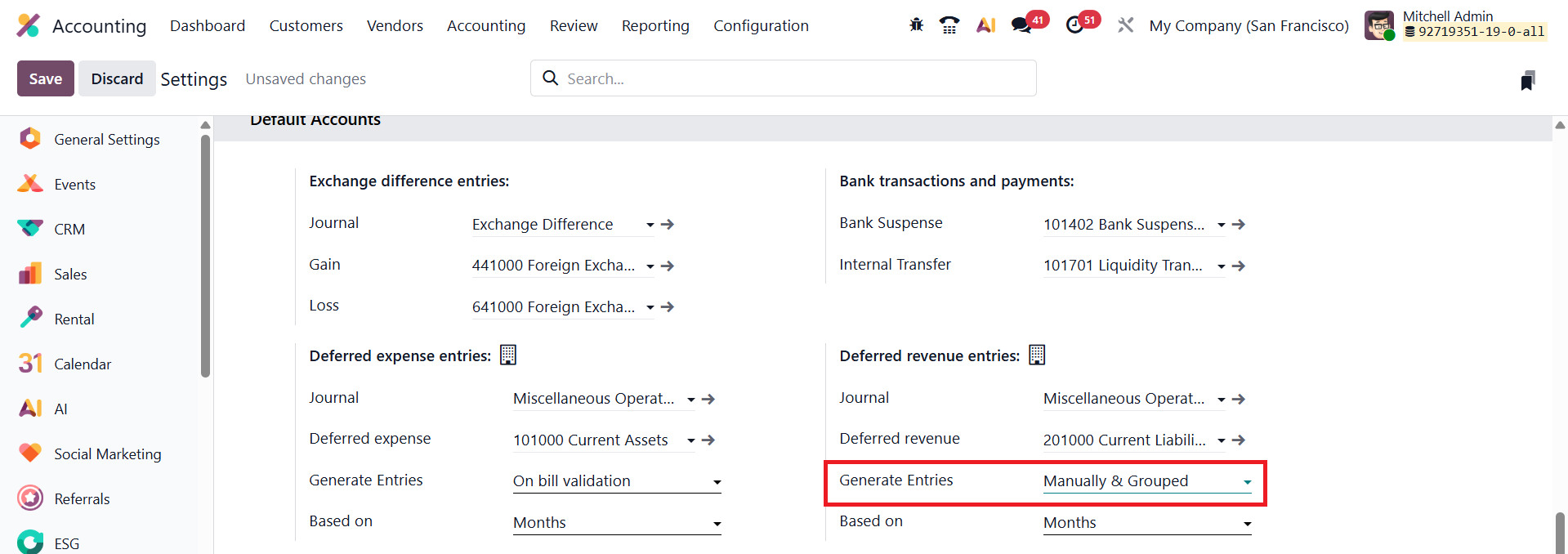 To enable this option, navigate to Accounting → Configuration → Settings, and under the Deferred Entries section, locate the Generate Entries field. Change the setting to Manually & Grouped, then save the configuration. Once this mode is activated, Odoo will no longer automatically create deferral journal entries when invoices or bills are validated.