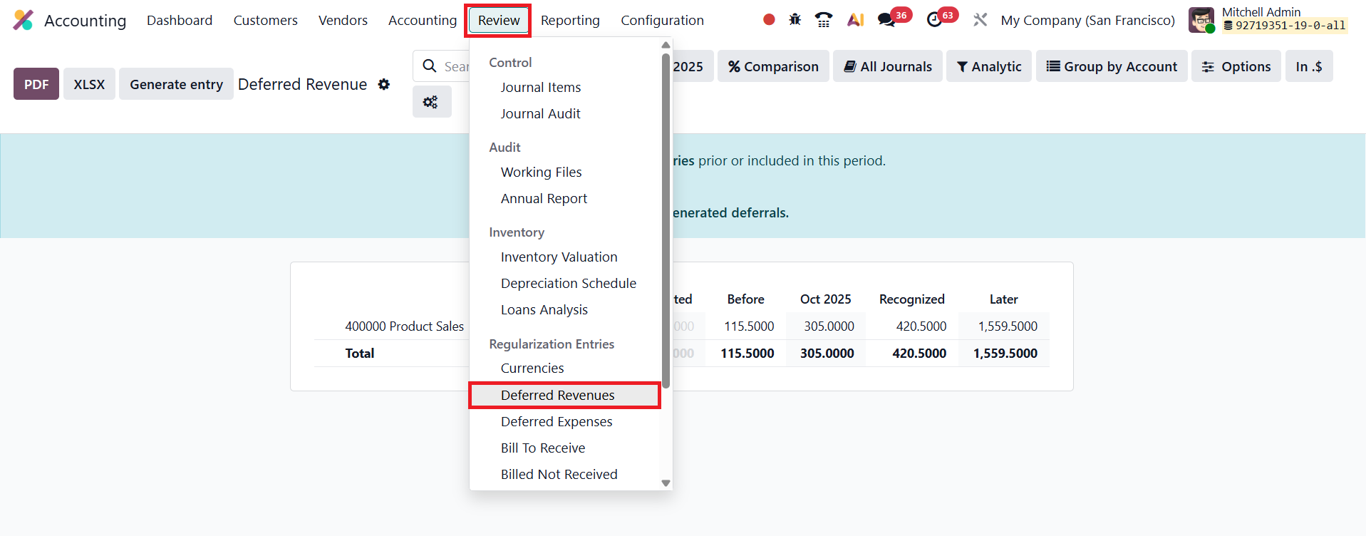 To recognize deferred revenues at the end of a reporting period, users can access the Deferred Revenue Report under Accounting → Review → Deferred Revenue.