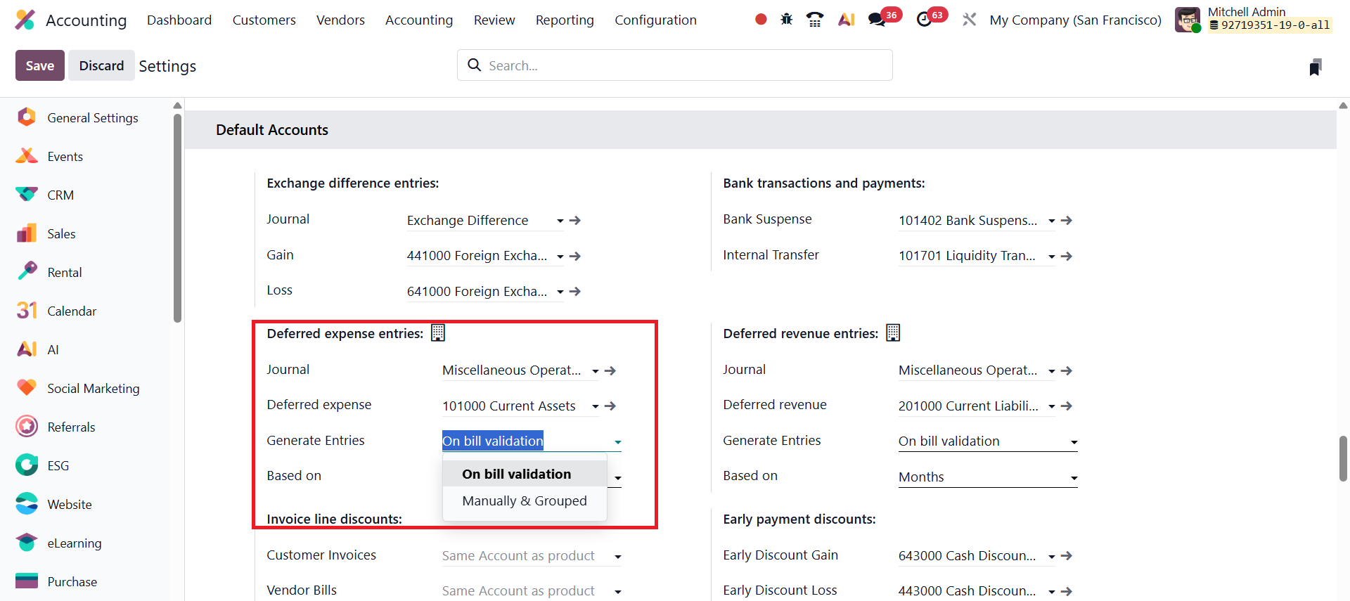 In Odoo 19 Accounting, when the Generate Entries field is set to On Bill Validation, the system automatically creates all necessary deferral entries at the moment a vendor bill is validated. This automation significantly simplifies the management of deferred expenses, ensuring that accounting entries are generated promptly and accurately without requiring manual intervention.
