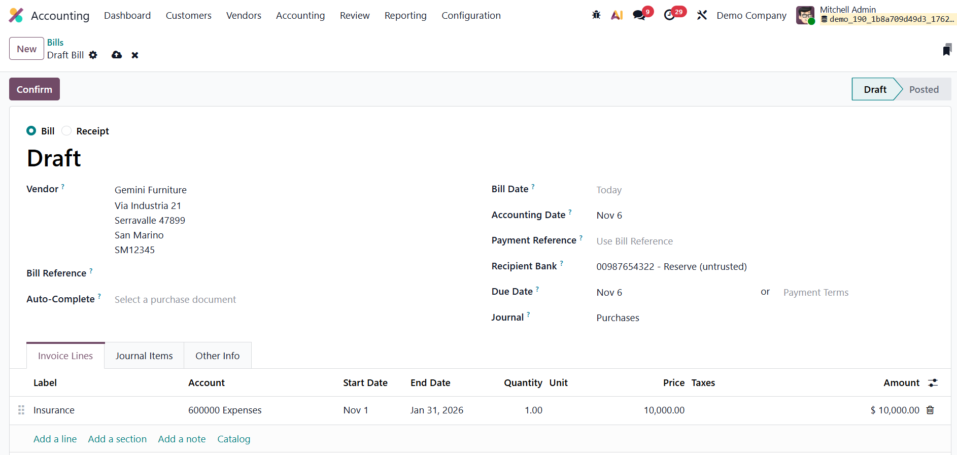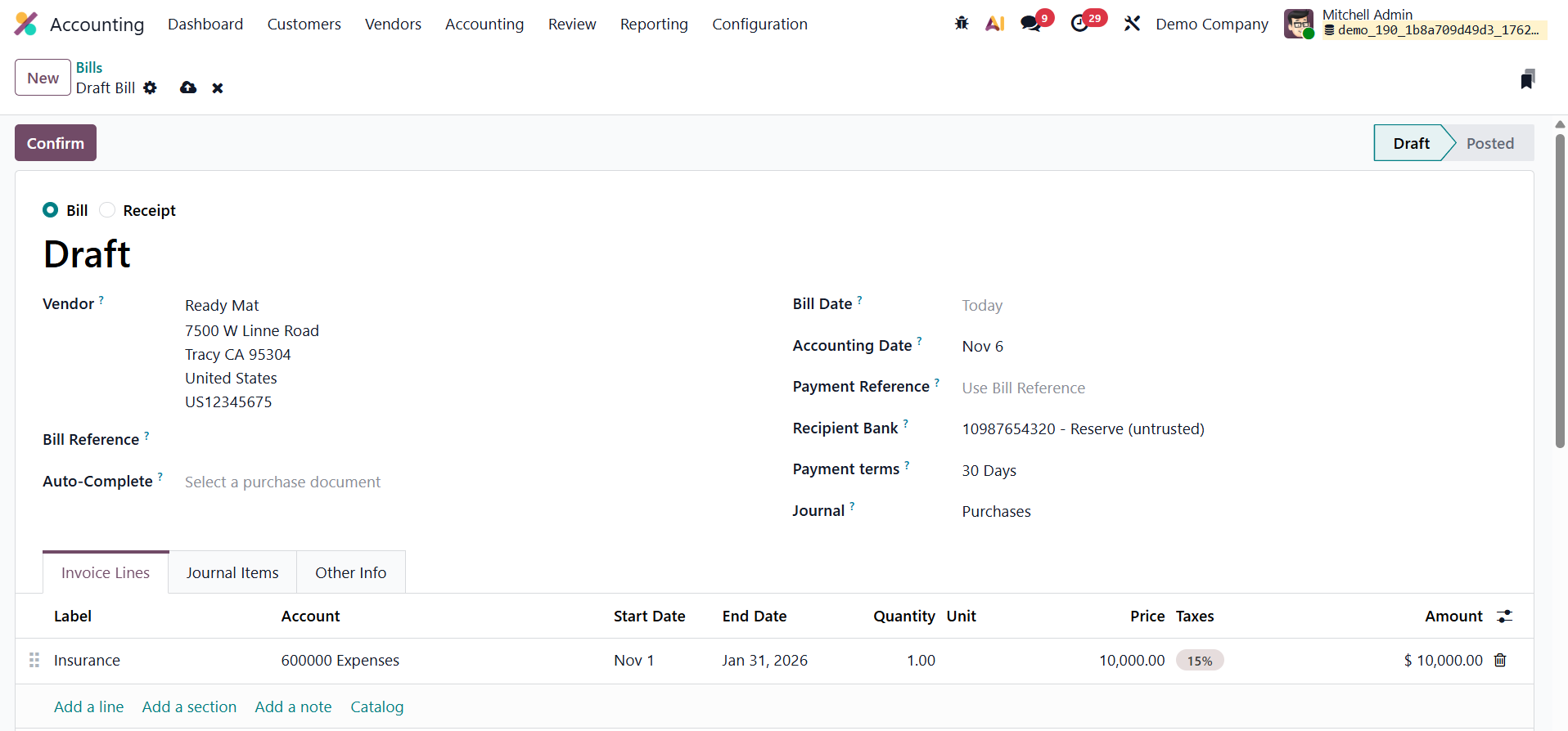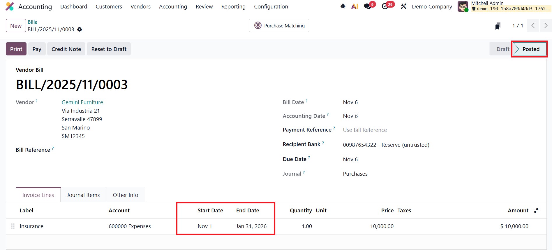 Next, create a new vendor bill by going to Vendors → Bills and clicking New. Enter the Vendor Name, Bill Reference, Bill Date, Accounting Date, Payment Terms, and Journal. In the Invoice Line, add the service product, for example, Insurance, and specify the Start Date and End Date to indicate the period over which the service applies. Once the details are complete, confirm the bill.