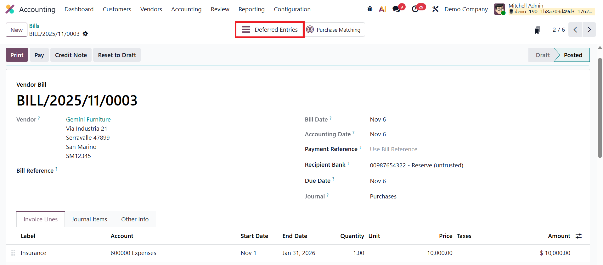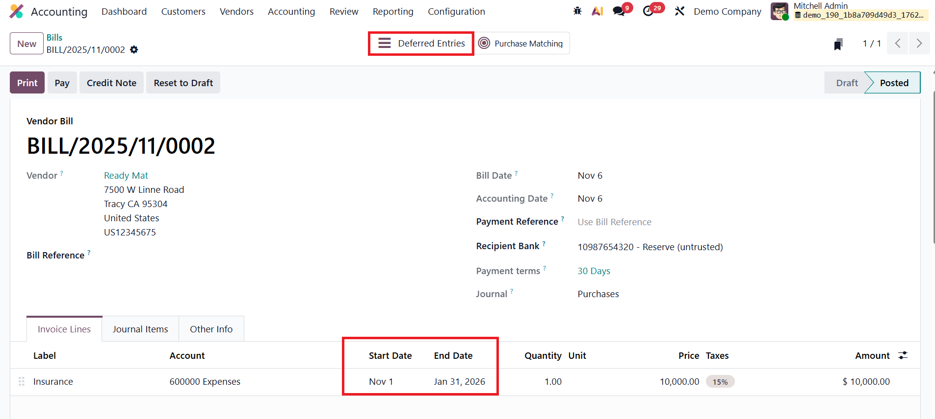 For example, consider a case where the company receives a vendor bill for a three-month Insurance service. In the Bill Line section, select the appropriate Service Product and specify the Start Date and End Date to clearly define the coverage period of the service. Once all details are entered, confirm the bill. After confirmation, the bill’s status changes to Posted, and a smart tab labeled Deferred Entries appears at the top of the bill form. Clicking on this tab opens the automatically generated deferral entries associated with that bill.