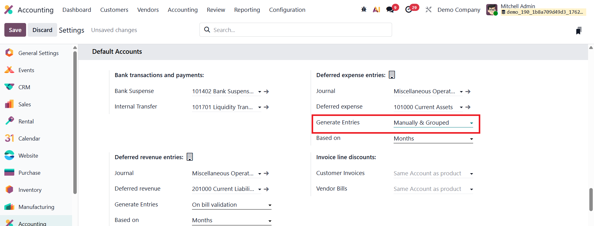 To activate this setting, open the Accounting module, navigate to Configuration → Settings, and scroll to the Deferred Entries section. Under the Generate Entries field, select Manually & Grouped, then click Save. This configuration instructs Odoo not to automatically create individual journal entries for each bill but to allow users to manually generate grouped deferral entries at the end of a specified period, typically every month.