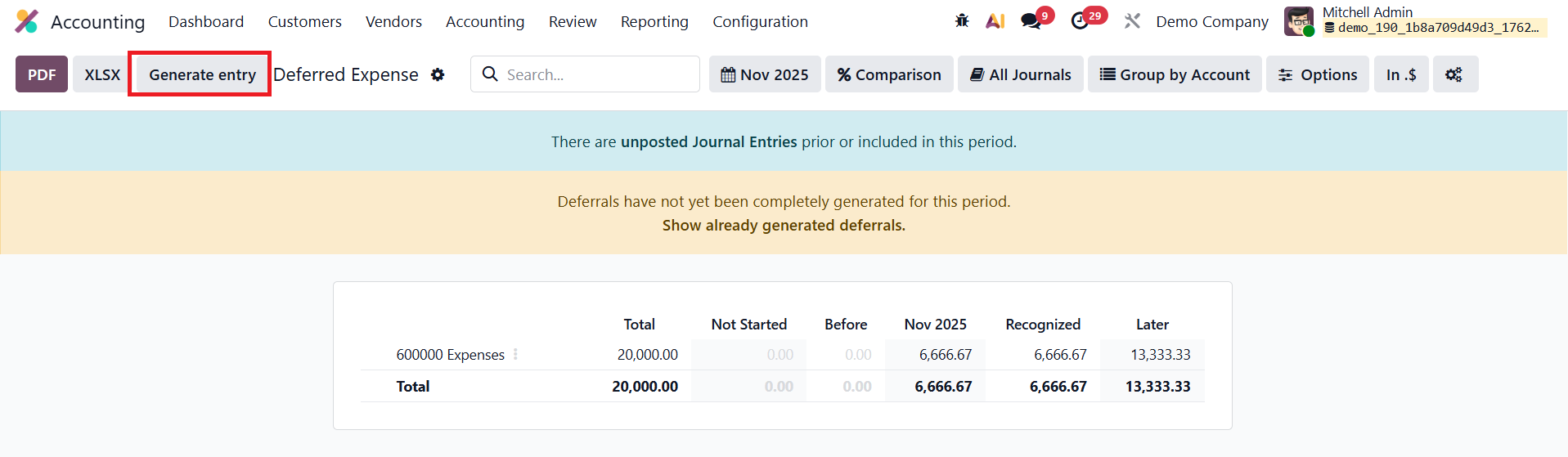 At the end of each month, accountants can generate all pending deferred entries at once by clicking the Generate Entries button in the Deferred Expense Report.