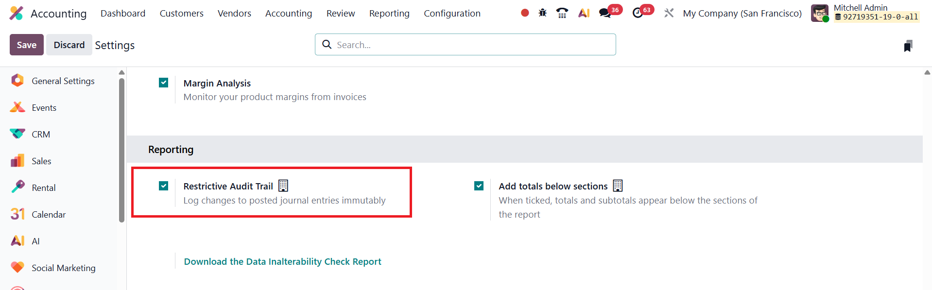 To enable this feature, navigate to Accounting → Configuration → Settings, and under the Reporting section, activate the Restrictive Audit Trail option.
