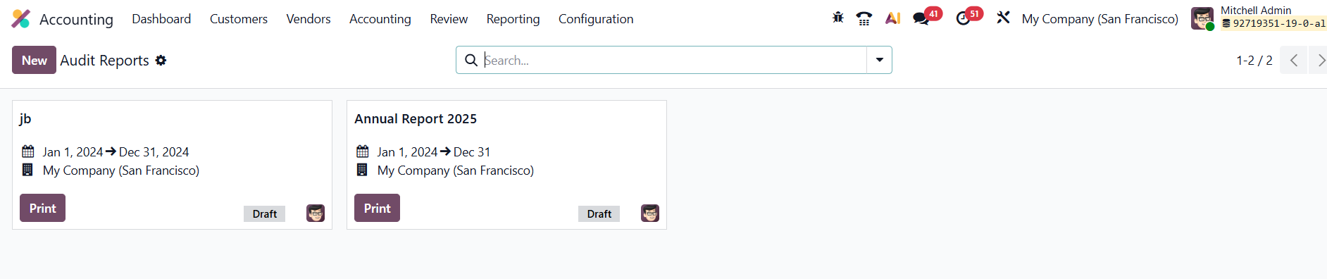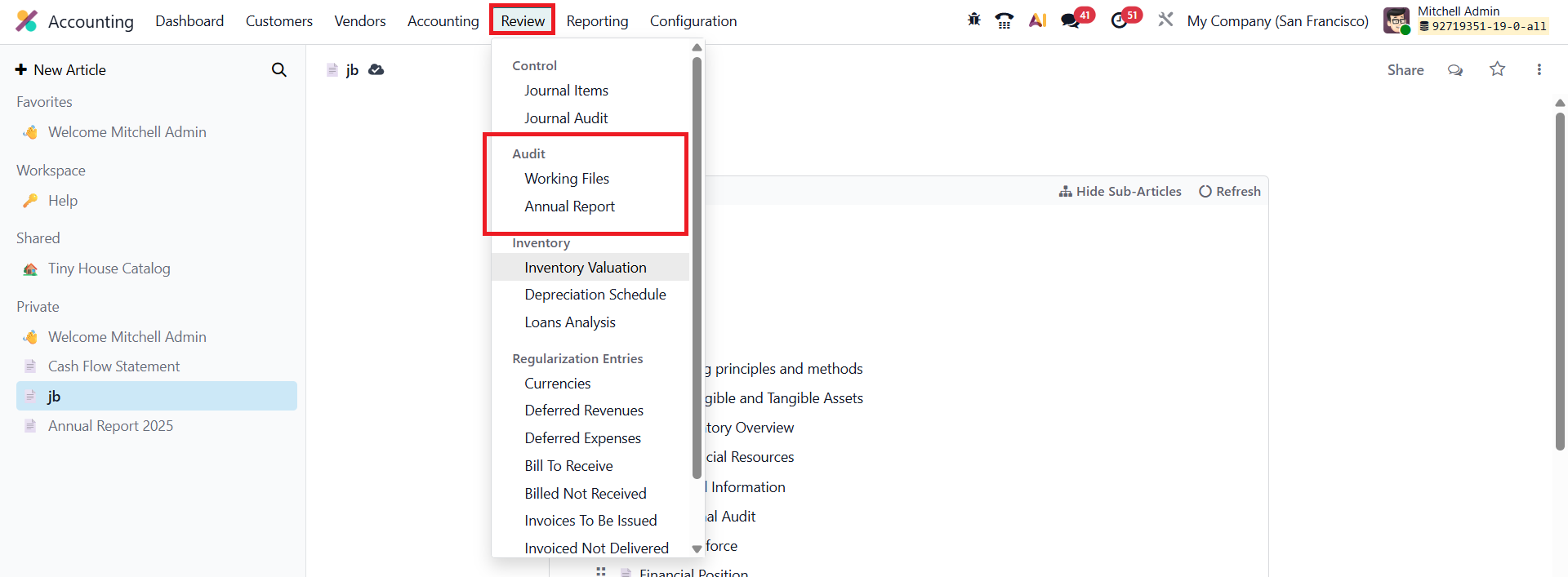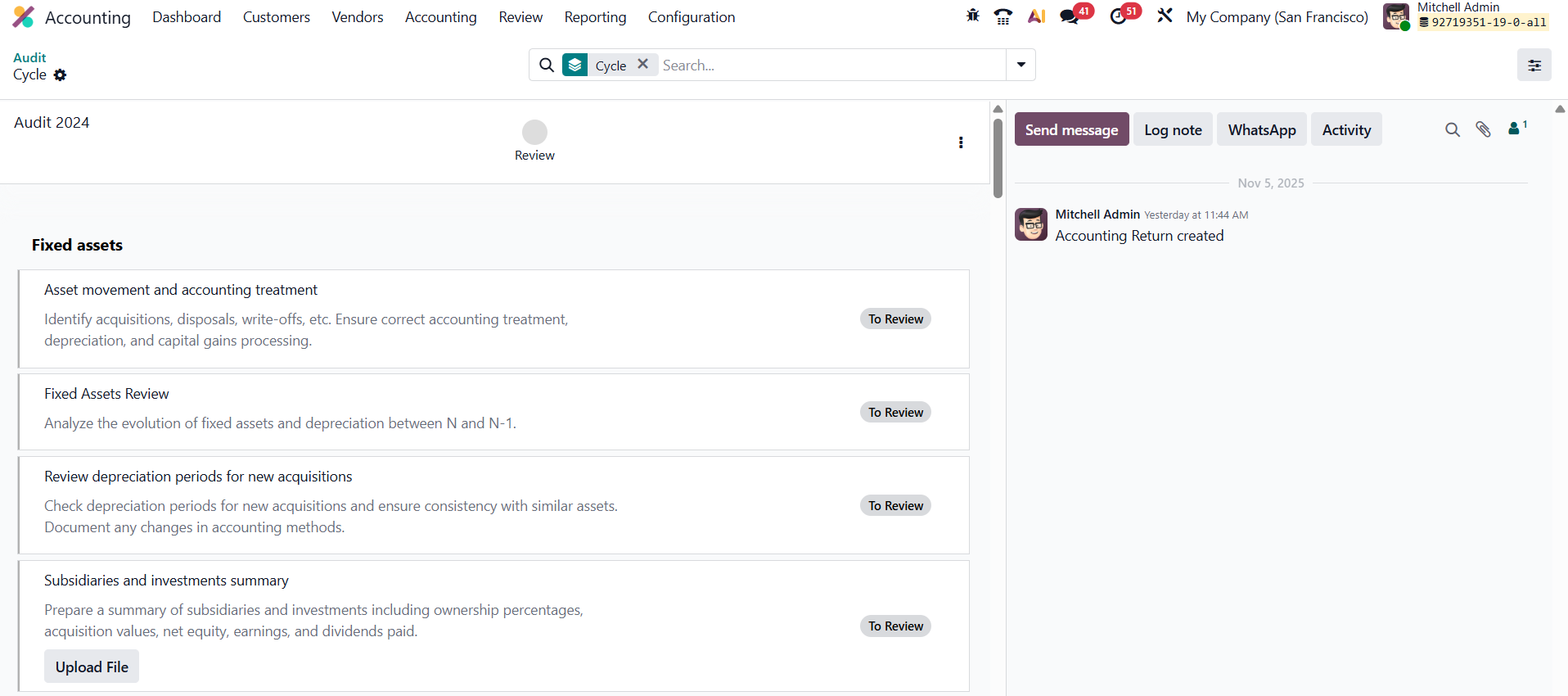 In Odoo 19 Accounting, the Working Files feature, found under the Review menu, serves as a practical tool for managing and standardizing internal audit processes. It allows users to create structured templates for audit-related checklists and to-do items, such as vendor performance reports or purchase order reviews.