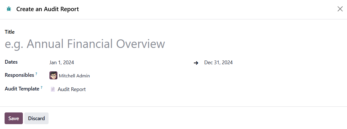 Here, you can mention Title, Dates, Responsibles, and Audit Template.