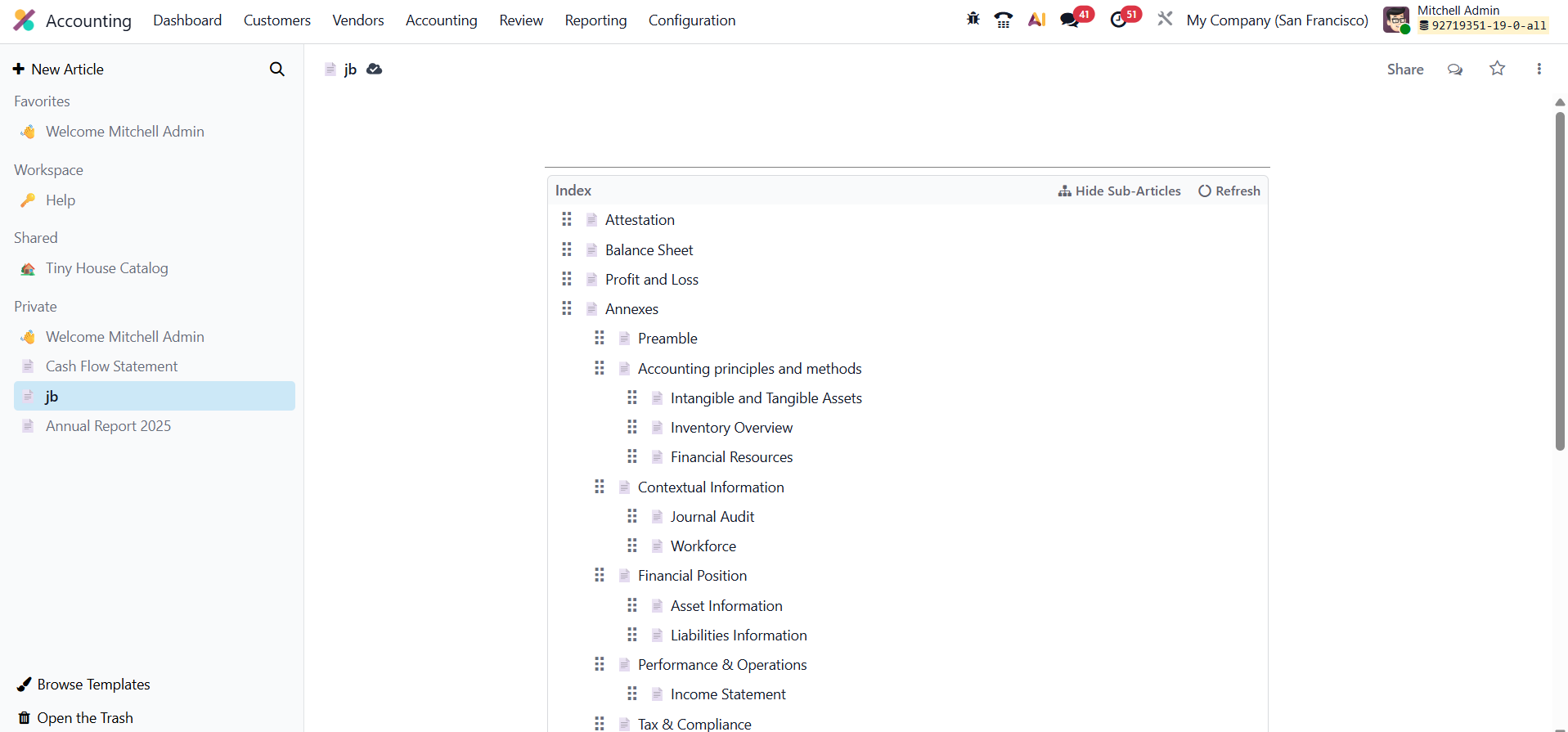 Odoo generates a predefined template for the audit report, sourcing the content and structure from the Knowledge section. Clicking the template redirects the user to the Knowledge section, where the complete, preloaded hierarchy of the audit report is visible. Other components like PNL and preamble content are also part of this structure, allowing users to build and connect their audit reports to auditors. The feature allows for quick generation of the entire report in a nicely formatted, printable PDF. The final printed report includes a summary, title, logo, selected company information, and a comprehensive table of contents based on the selected content.