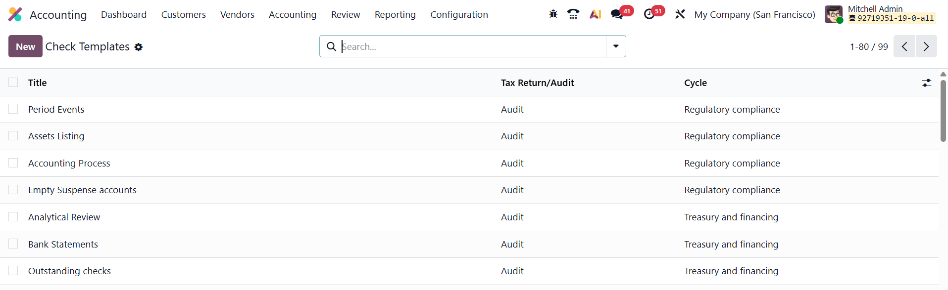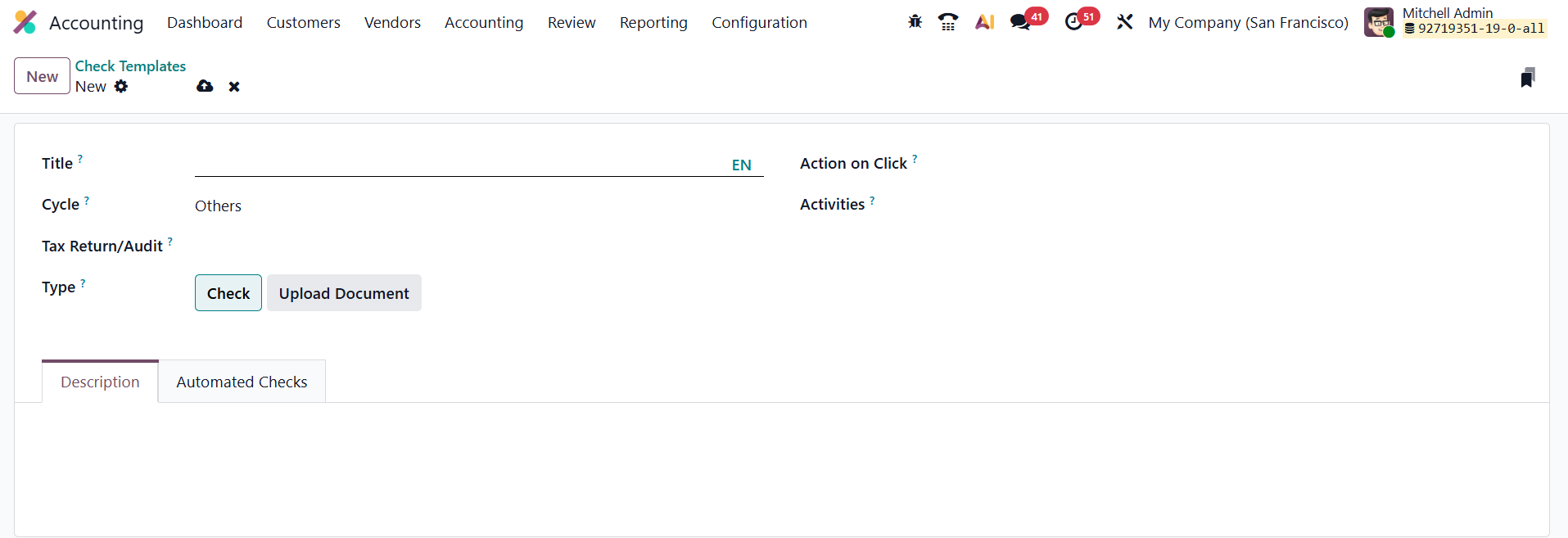 In Odoo 19 Accounting, the Check Templates feature, available under Configuration → Check, is an advanced tool designed to enhance audit and review processes. It enables users to create reusable templates for audit checklists and review procedures, ensuring consistency and efficiency in financial audits.