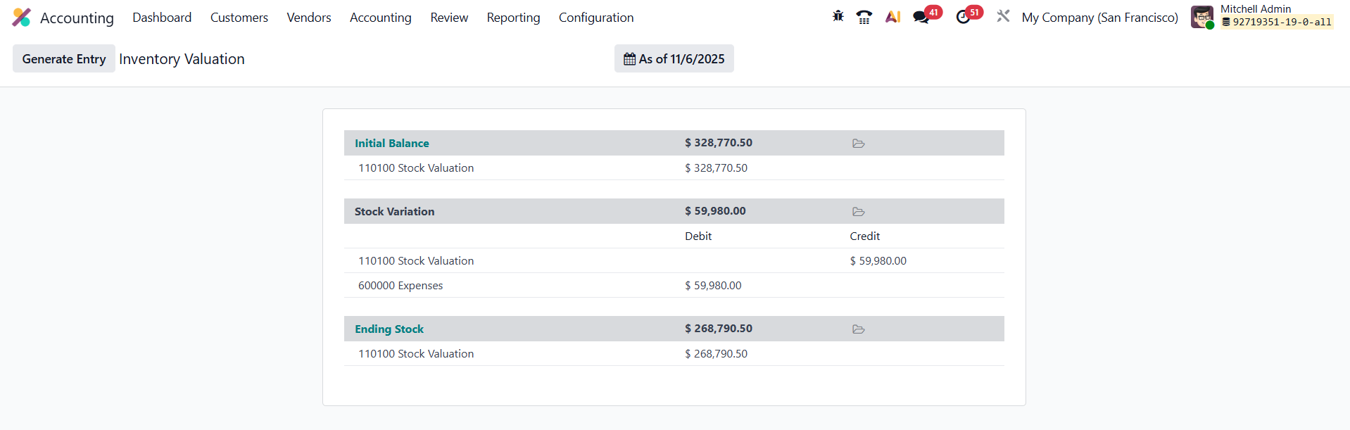 In Odoo 19 Accounting, the Inventory Valuation Report, accessible through the Accounting → Review → Inventory Valuation menu, provides a clear summary of the