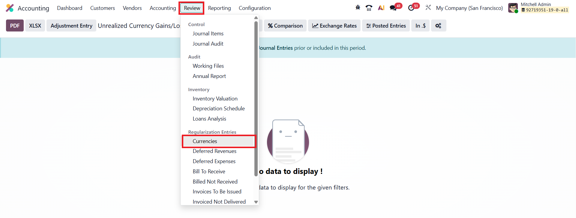 In Odoo 19 Accounting, the Unrealized Currency Gains/Losses report, available under the Review menu, provides an updated and detailed overview of all open balance sheet accounts that require revaluation based on the latest exchange rates.