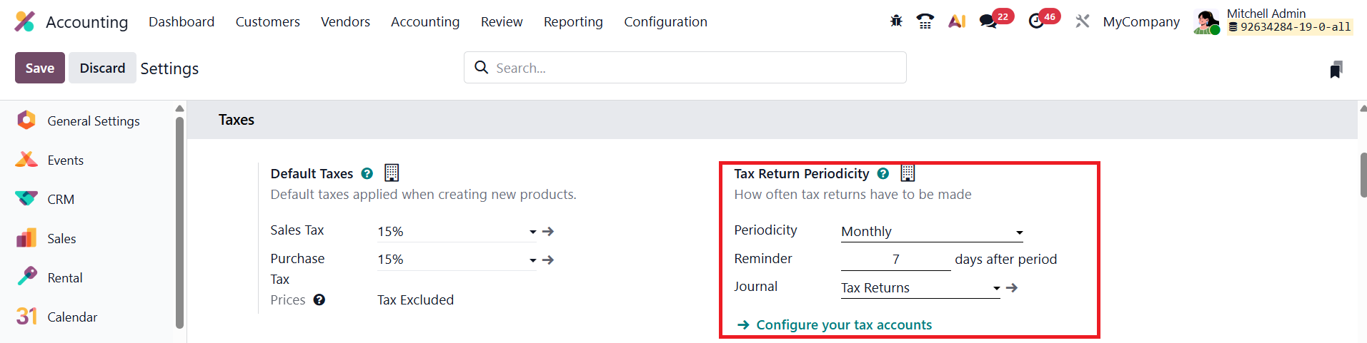 To configure this feature, navigate to Accounting ▸ Configuration ▸ Settings, and scroll down to the Tax Return Periodicity section. Here, you can adjust the settings according to your company’s reporting requirements.