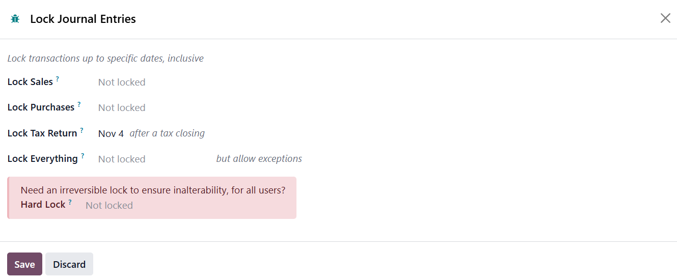 In Odoo 19, the Tax Return Lock Date feature plays a crucial role in maintaining the integrity and accuracy of VAT-related financial records. By setting a lock date, you prevent any modifications to journal entries that could affect previously reported VAT amounts. Locking the tax period before generating the Closing Journal Entry helps safeguard the accuracy of your final tax report and minimizes the risk of discrepancies or compliance errors.