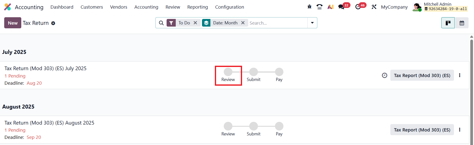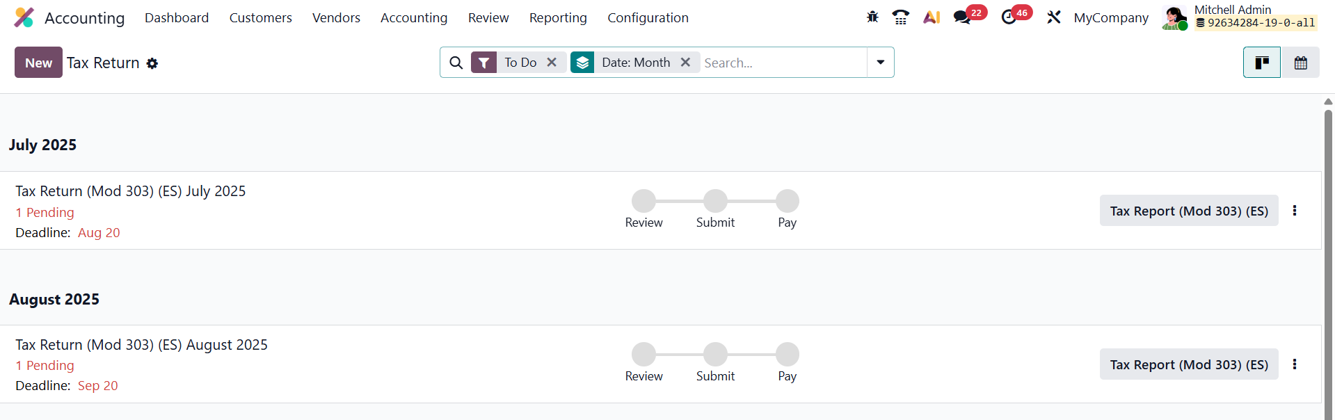 The Tax Return view presents a chronological list of all pending tax returns and advance payments, organized according to the company’s fiscal localization. Each item in the list includes the reporting period (month or quarter), the submission deadline, the related company and branch(es) (if applicable), and action steps such as Review, Submit, and Pay, each of which turns green once completed.