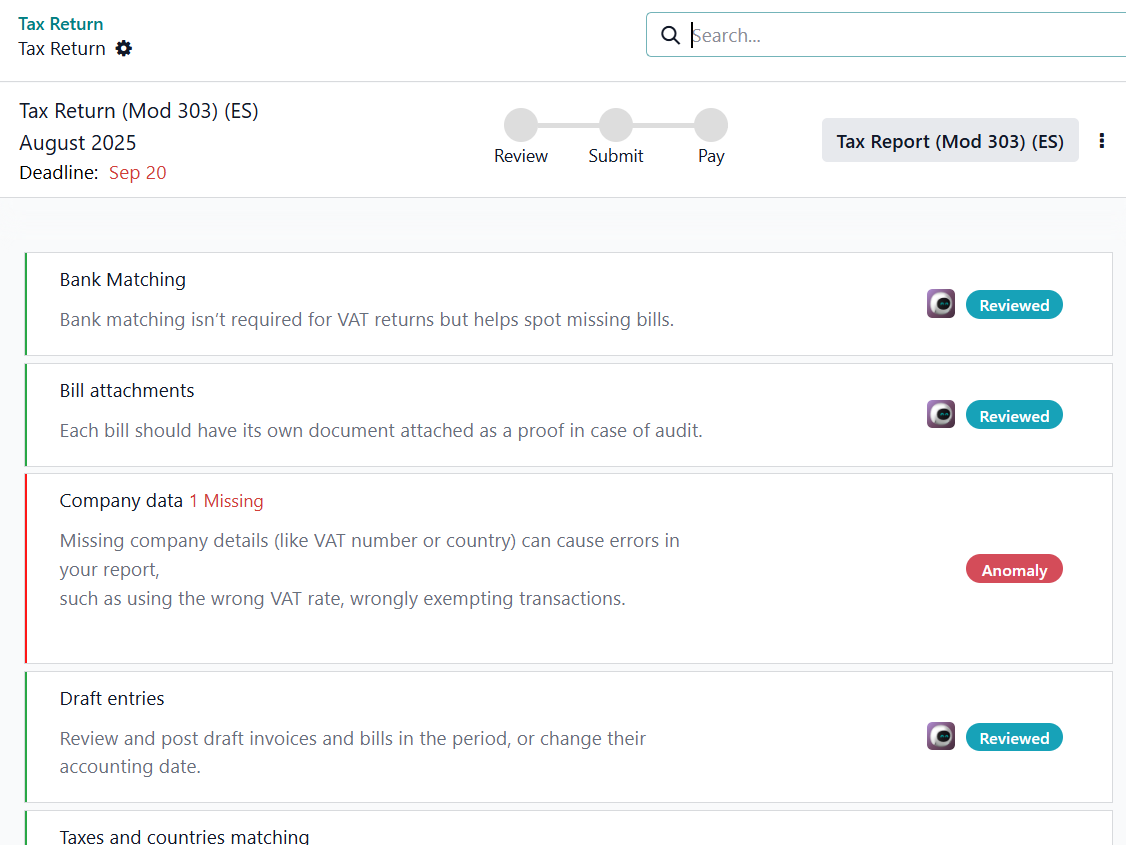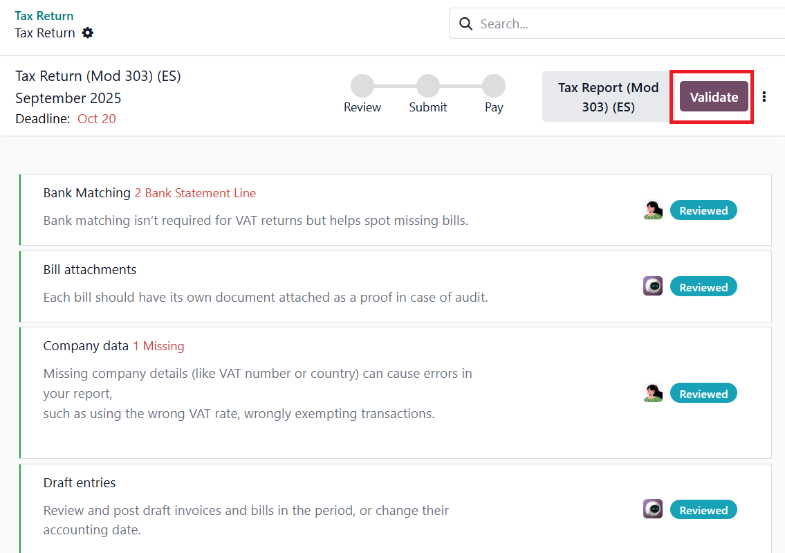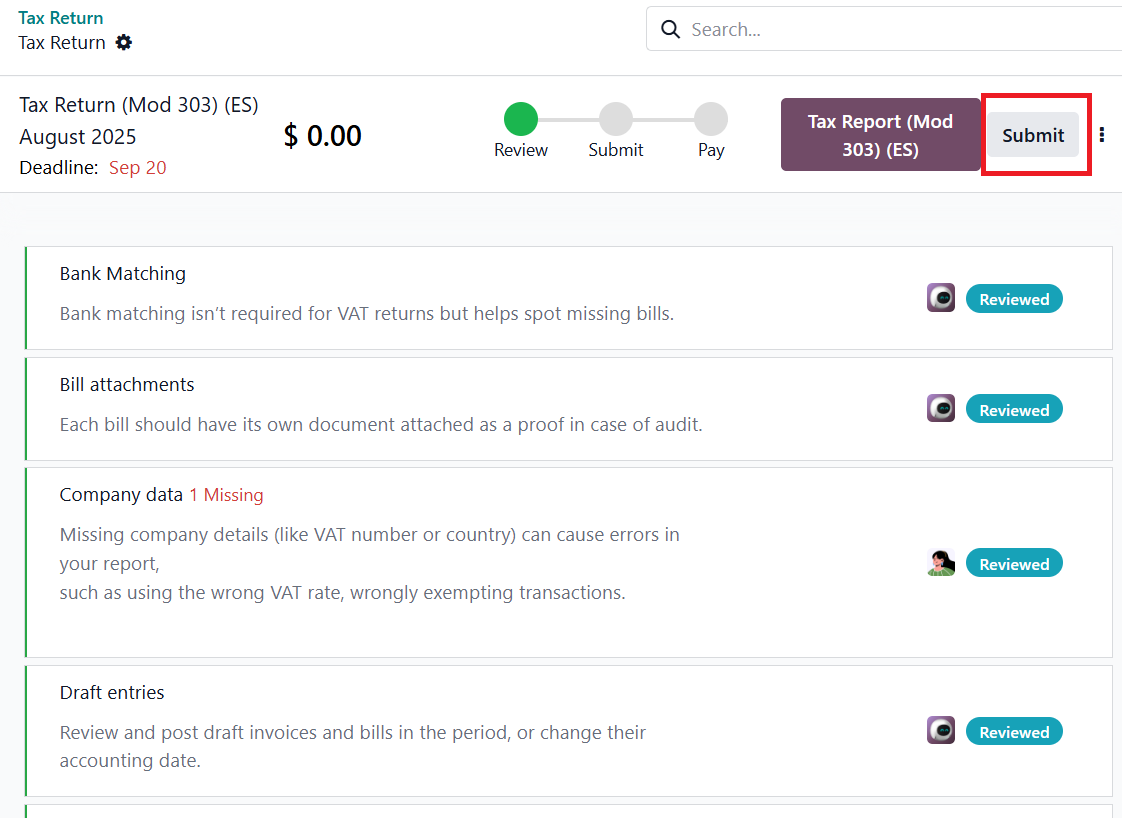 Odoo automatically performs several tax validation checks to ensure data consistency and regulatory compliance. If all checks are passed, the review is complete, and you can proceed to submission.