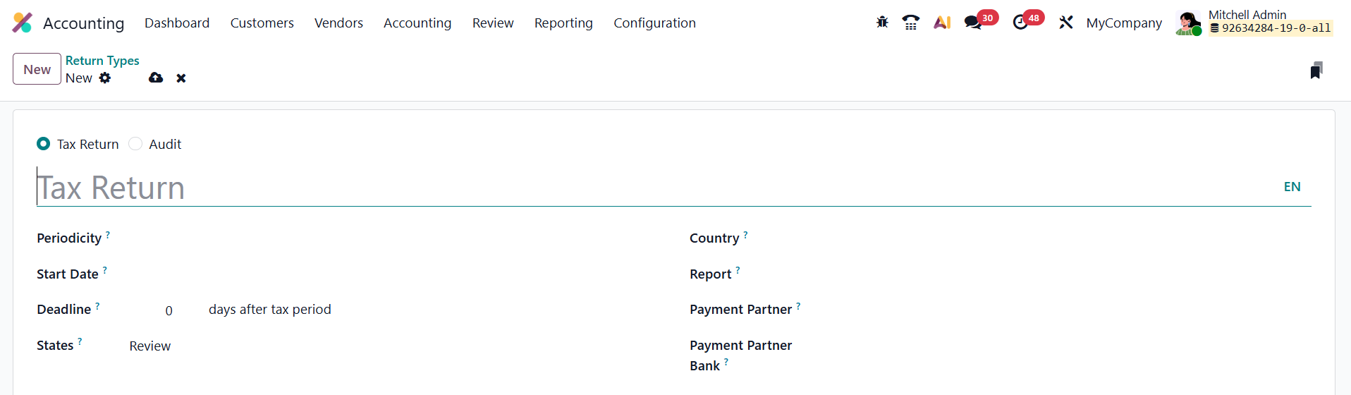 In Odoo 19 Accounting, you can configure different Tax Return Types to match your company’s tax reporting structure and regulatory requirements. These configurations determine how and when your tax reports are generated, reviewed, and submitted.